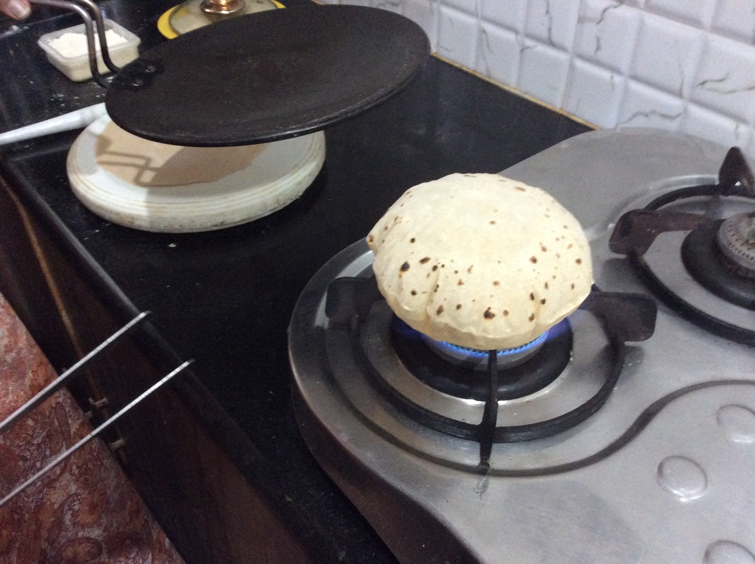 - Now on the full flame(on gas)put the reverse side of Phulka. It puffs.