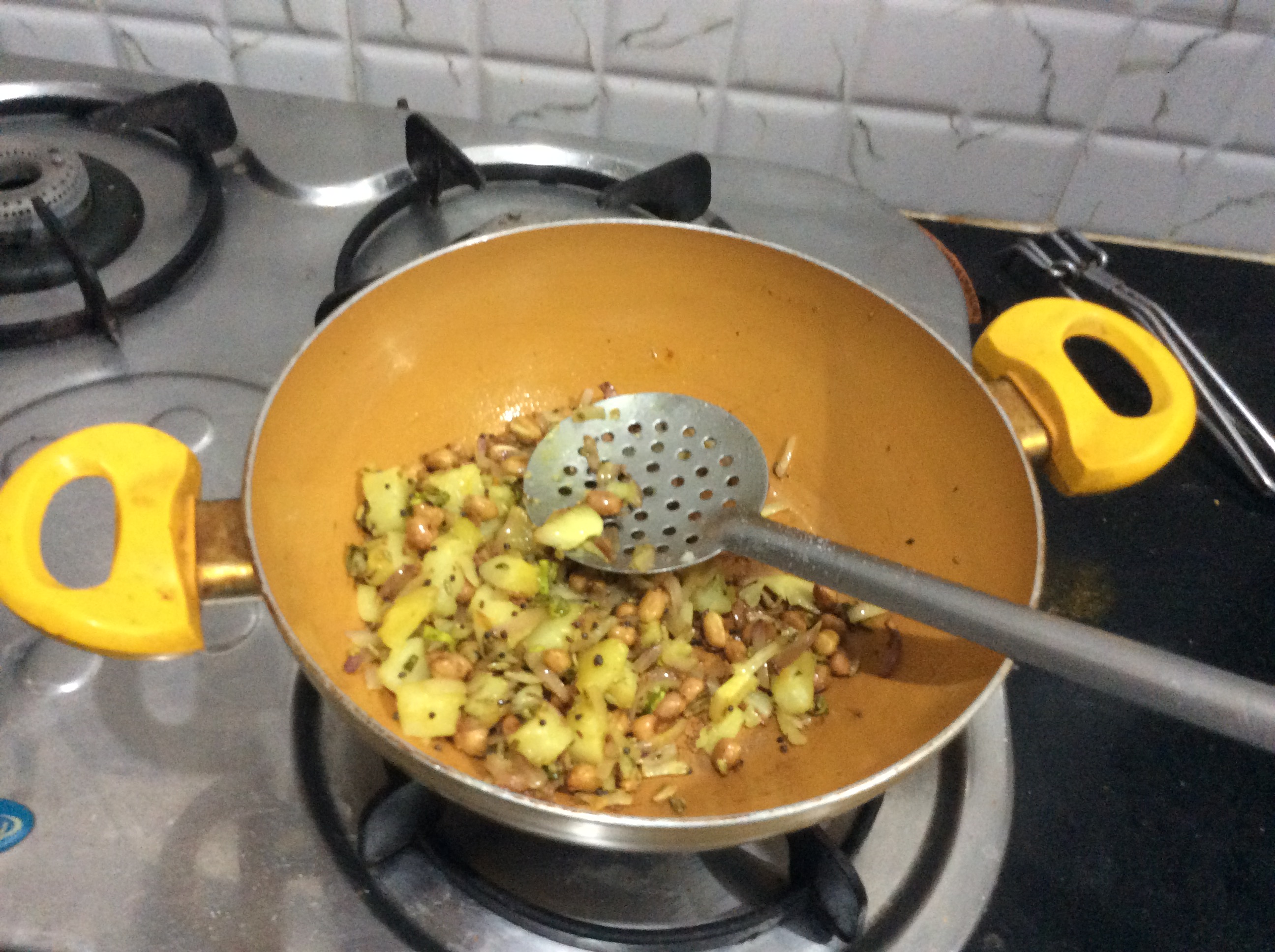 5)SAUTE; It means to brown or cook food in a small amount of oil or any fat using low medium flame(heat) for example onion is sauted for gravy or vegetables for poha.