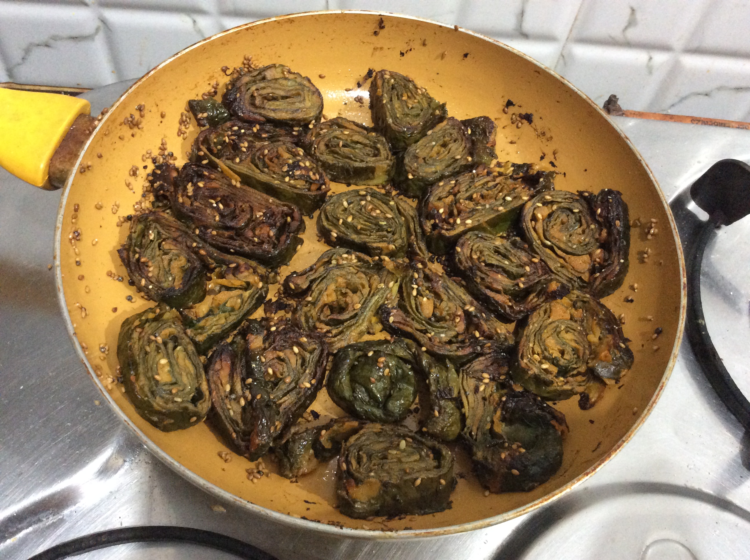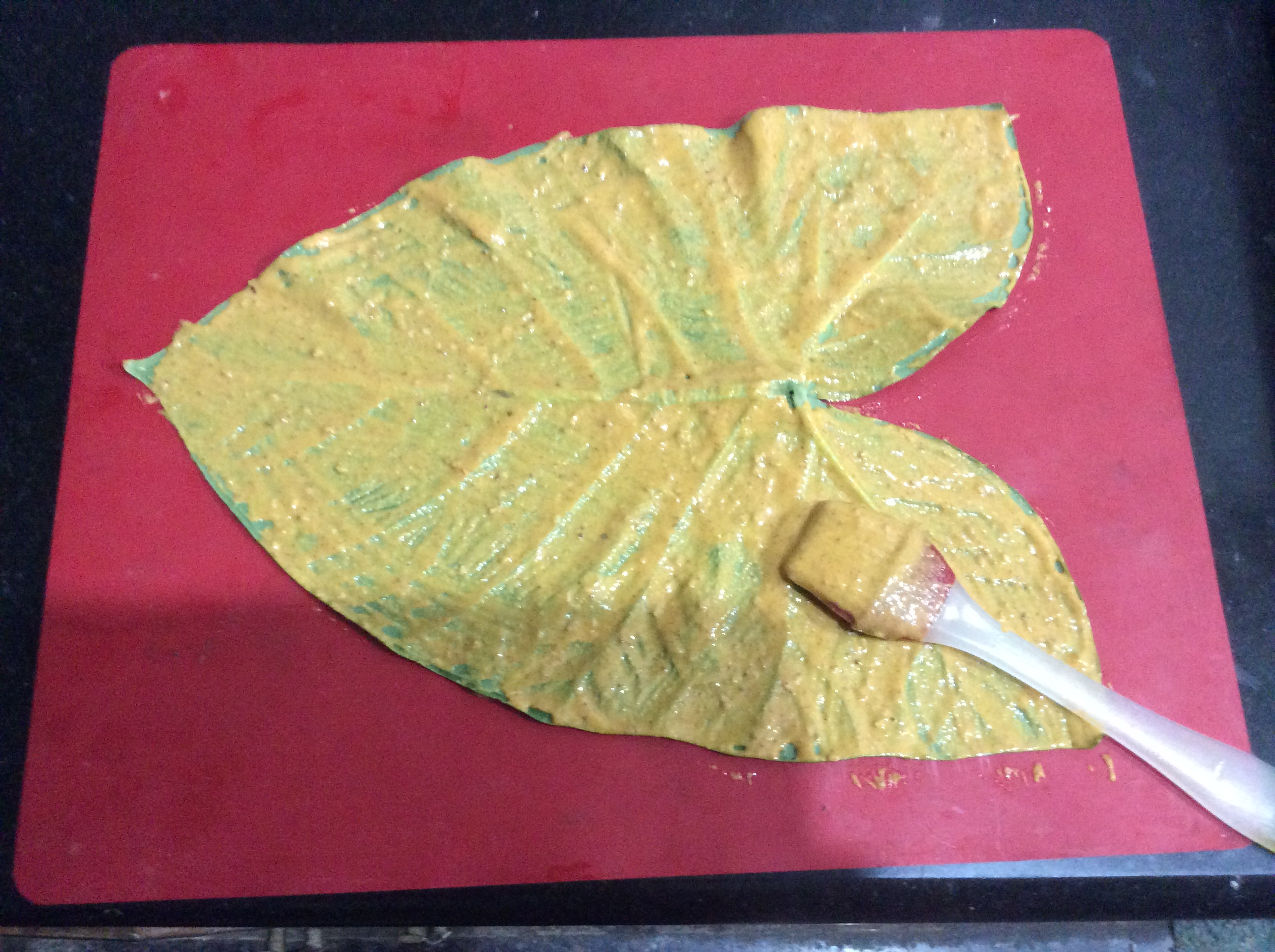 21)DREDGE; It means to coat food heavily with other ingredients. For example below Colocasia