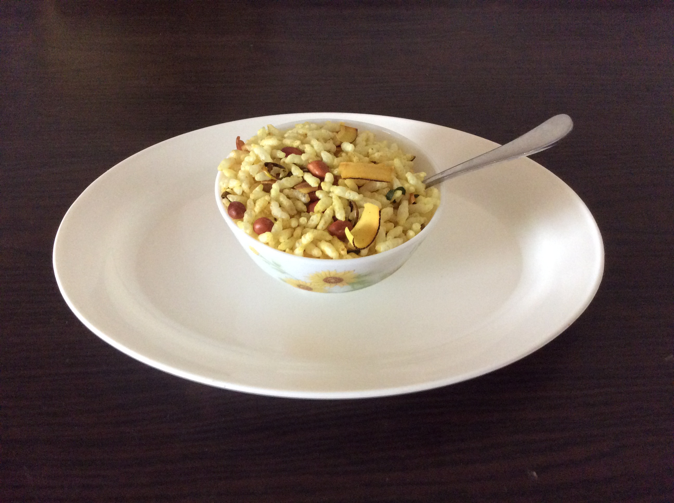 This is made in different methods. This may remind you of the churmuri that you get on the train, where they add carrots, onions, tomatoes, and different varieties of chutney with parmal or mumura.