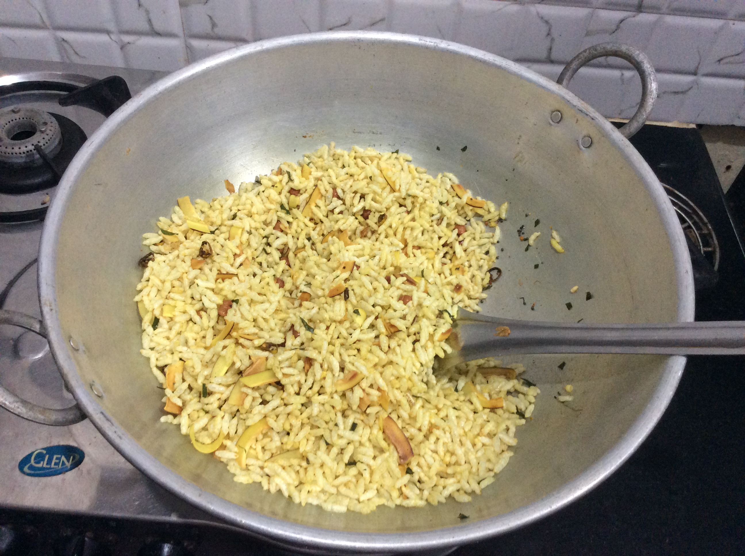 This masala puffed puri is light, and crispy, and also has a crunch of dry coconut and peanuts.