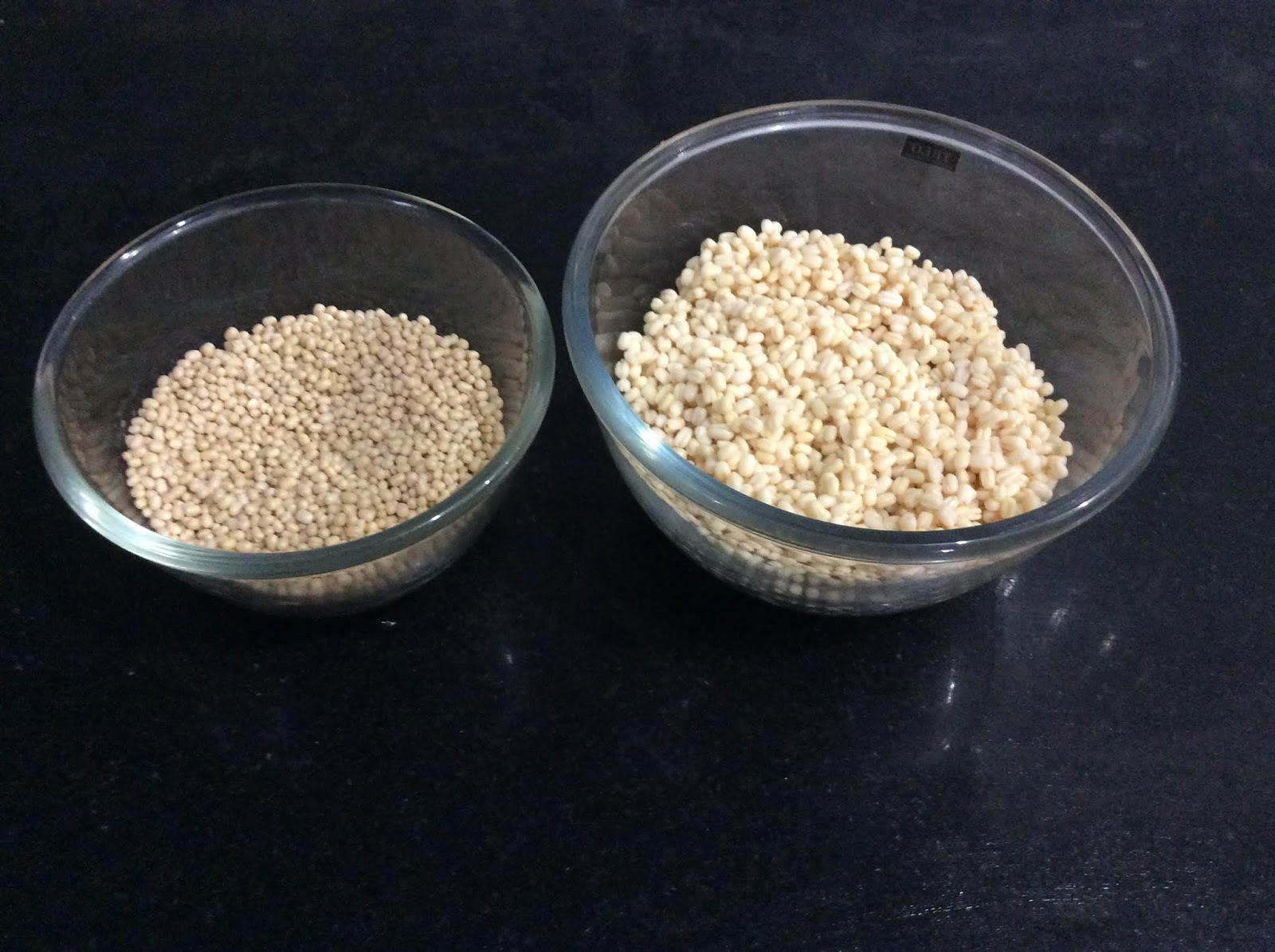 Take 1 cup of Whole urad gram, wash 2-3 times nicely, and soak in about 3 cups of water for about 3 hours. Strain the water after washing it once more. It is doubled in quantity. Now it can be ground.