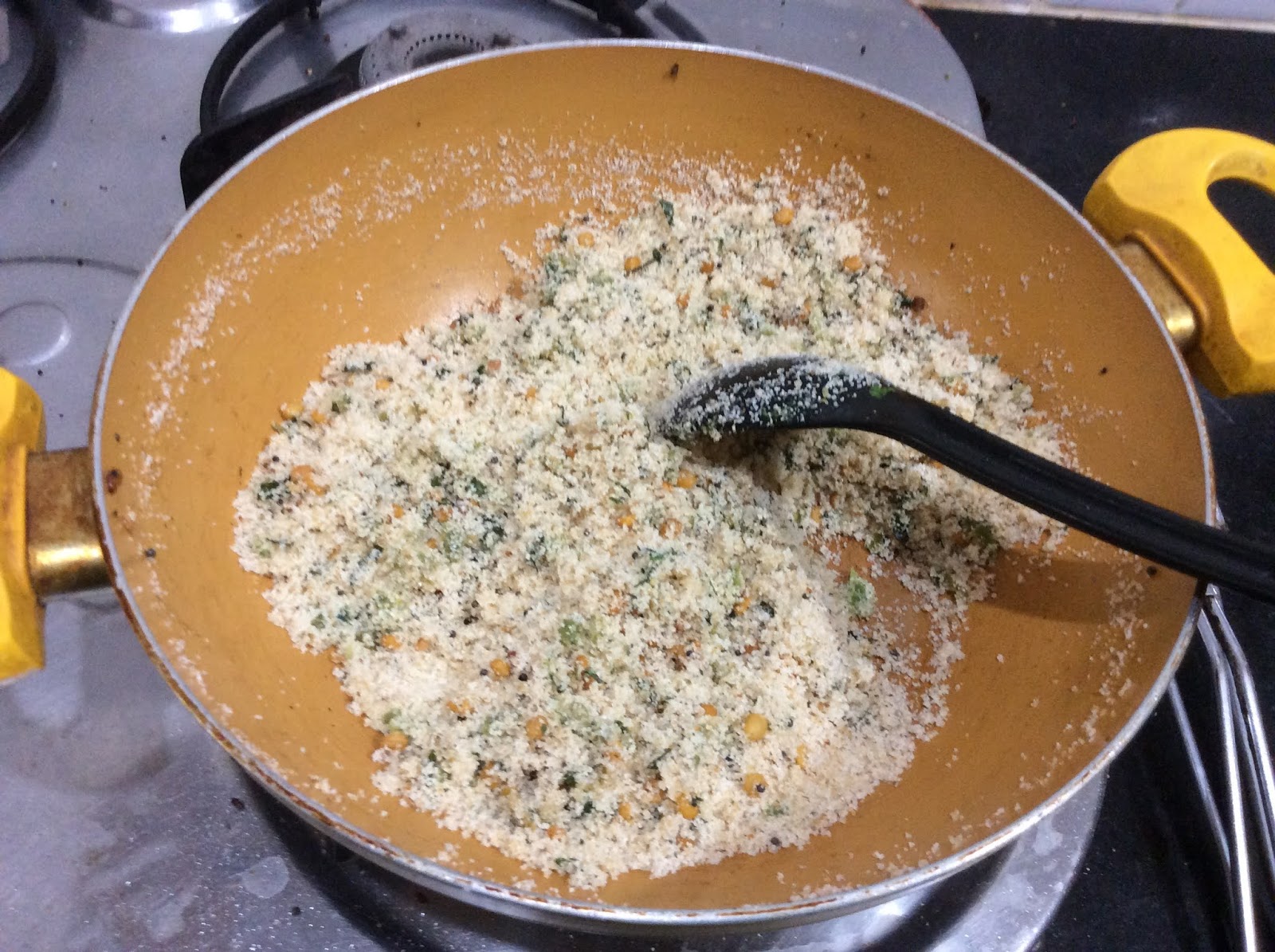 • The first thing you need to do is you have to dry roast RICE RAVA in a frying pan on low flame for about  4-5 minutes till the color of the rava changes and starts giving a nice aroma.