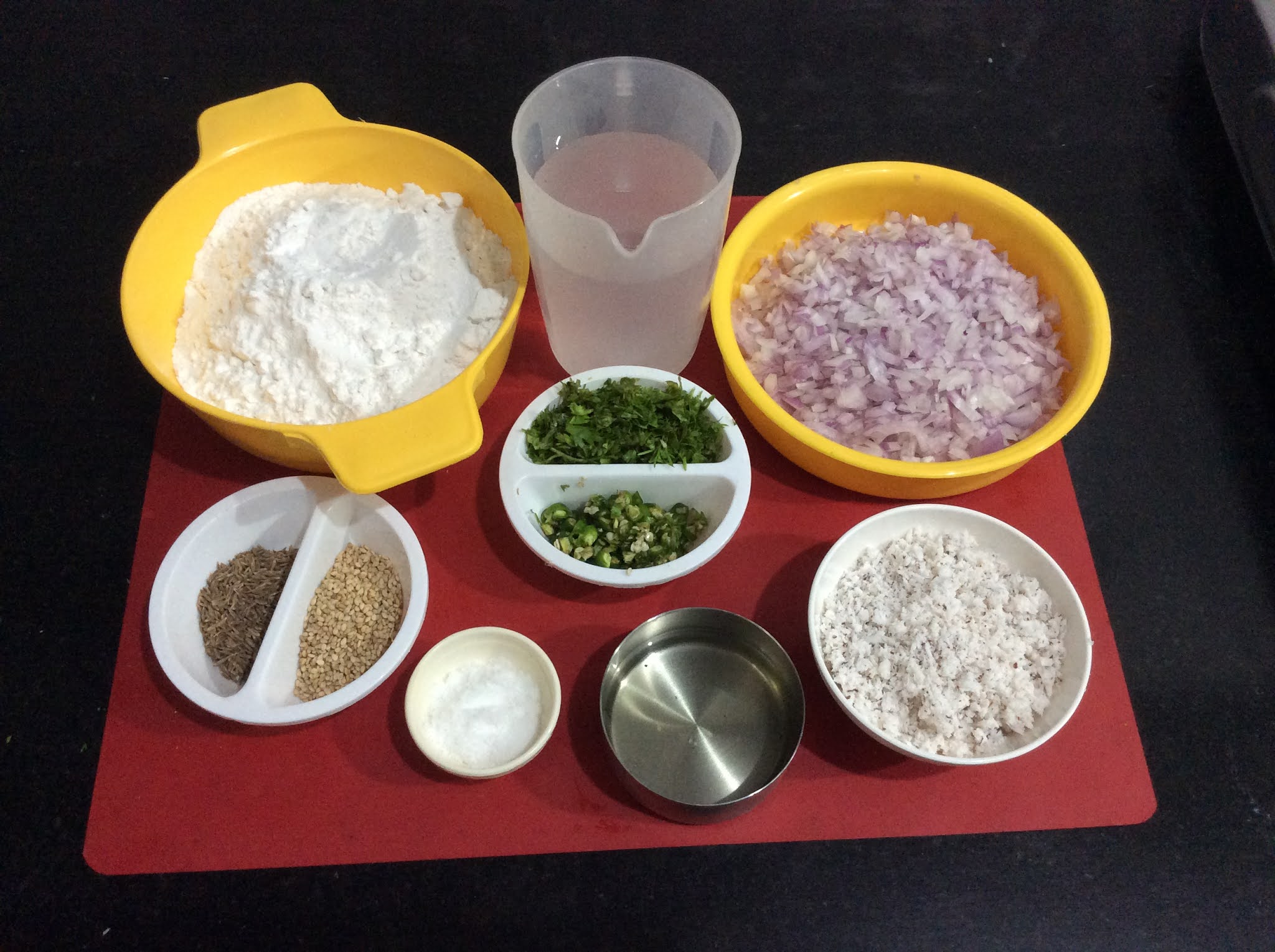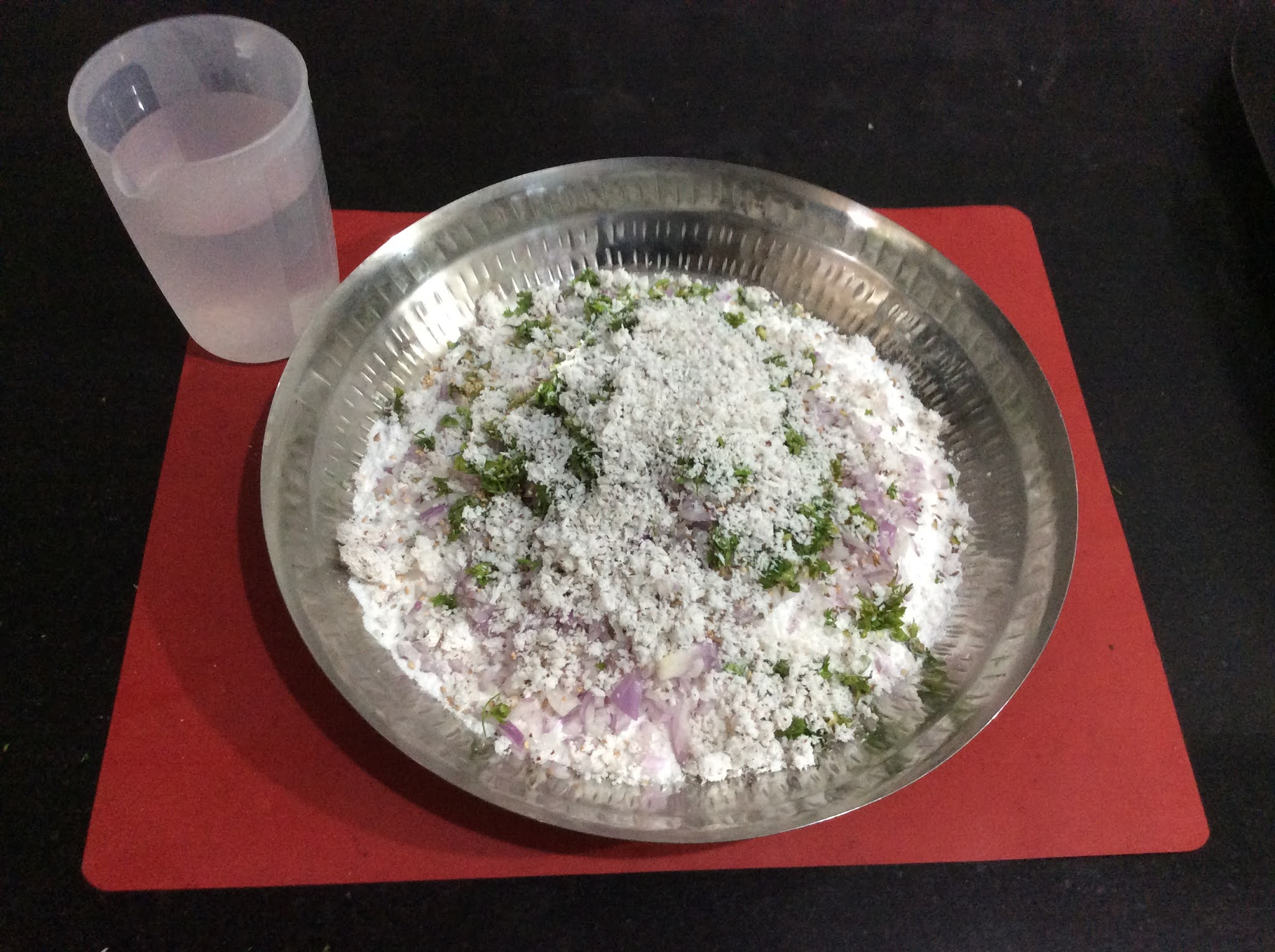 - Put rice flour, salt, cumin seeds, sesame (til) seeds, grated coconut, cut onions, green chilies, and coriander leaves.