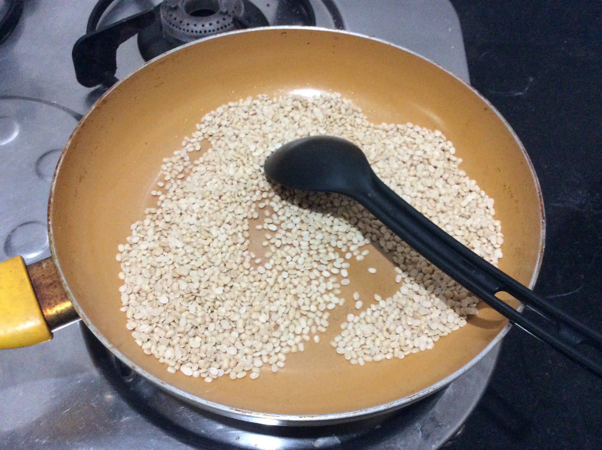 - When hot add urad dal and dry roast dal till slightly golden in color.