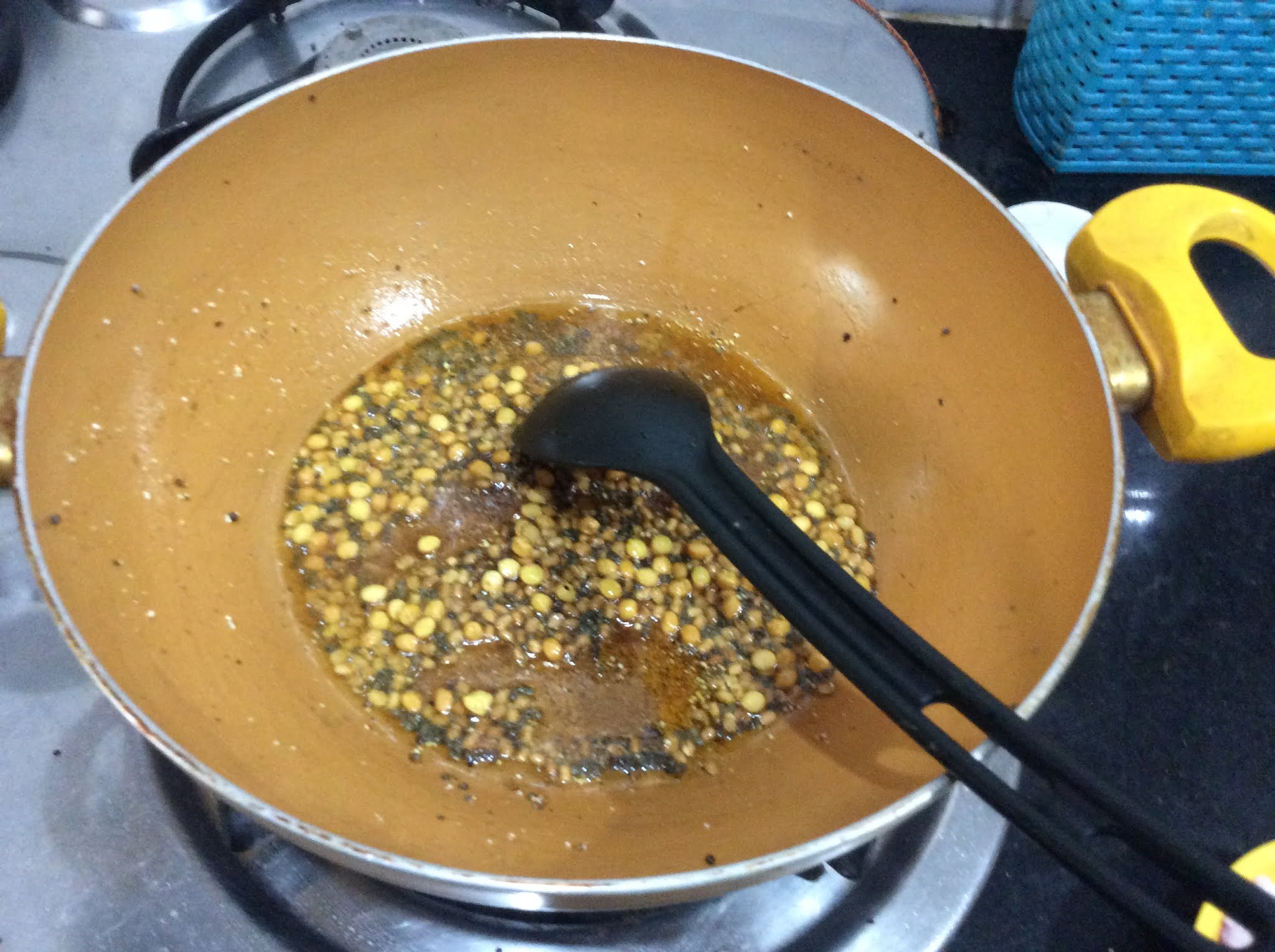 3. When the mustard seeds crackle add chana dal and urad dal. Let it turn golden brown.
