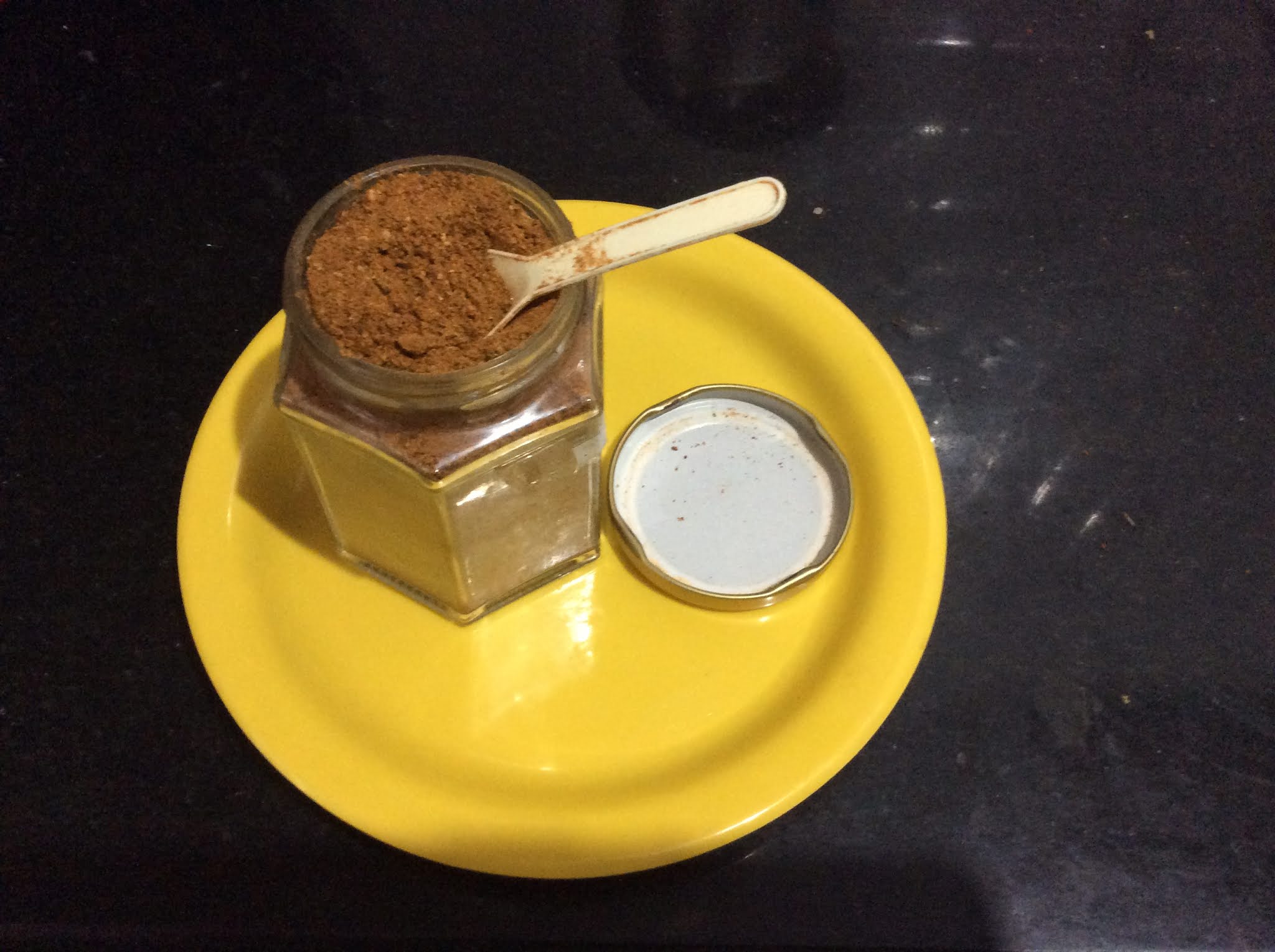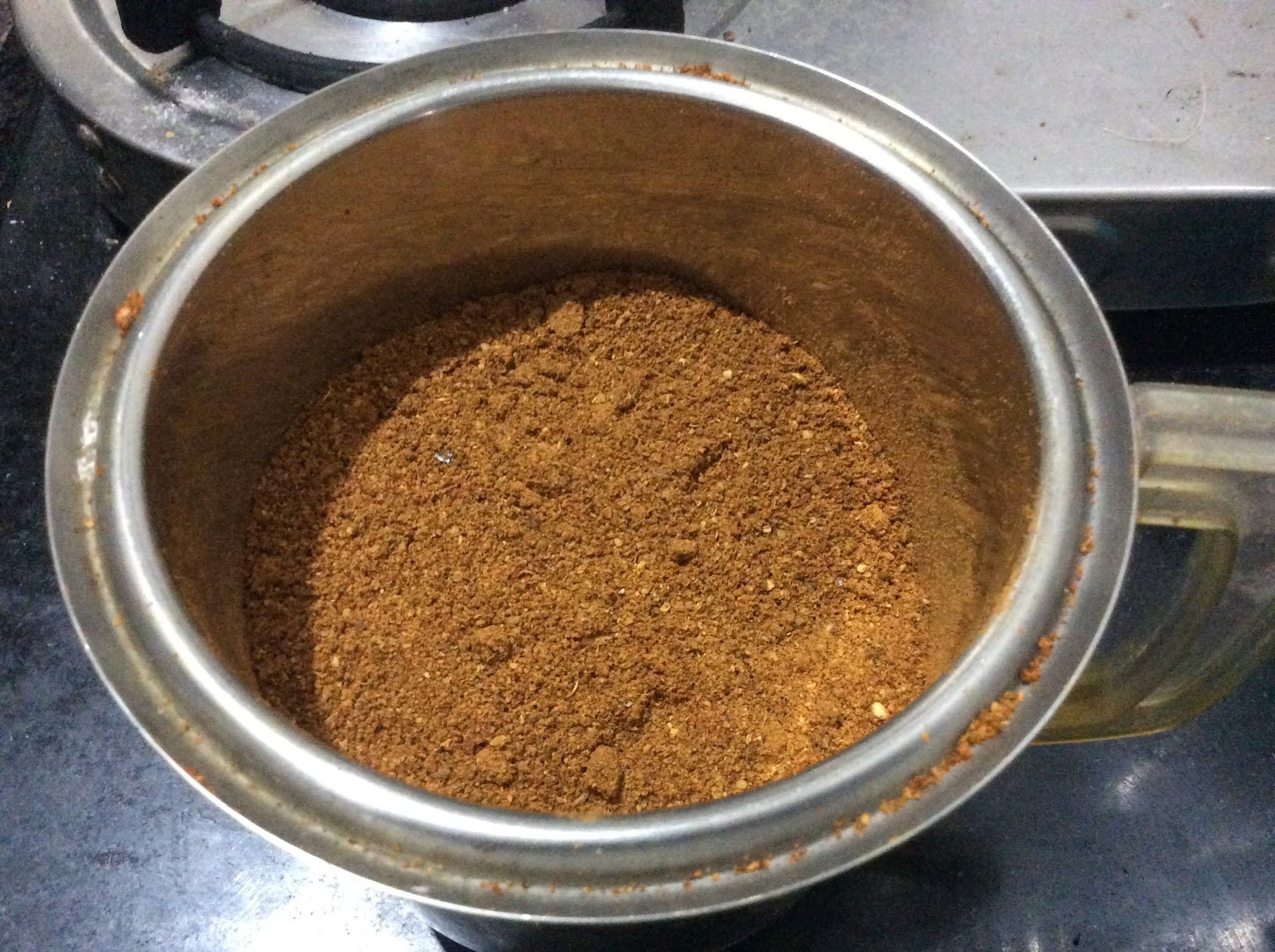 7. Grind them all together in a mixer grinder jar, to a coarse powder, and cool before storing it, in an air-tight jar.