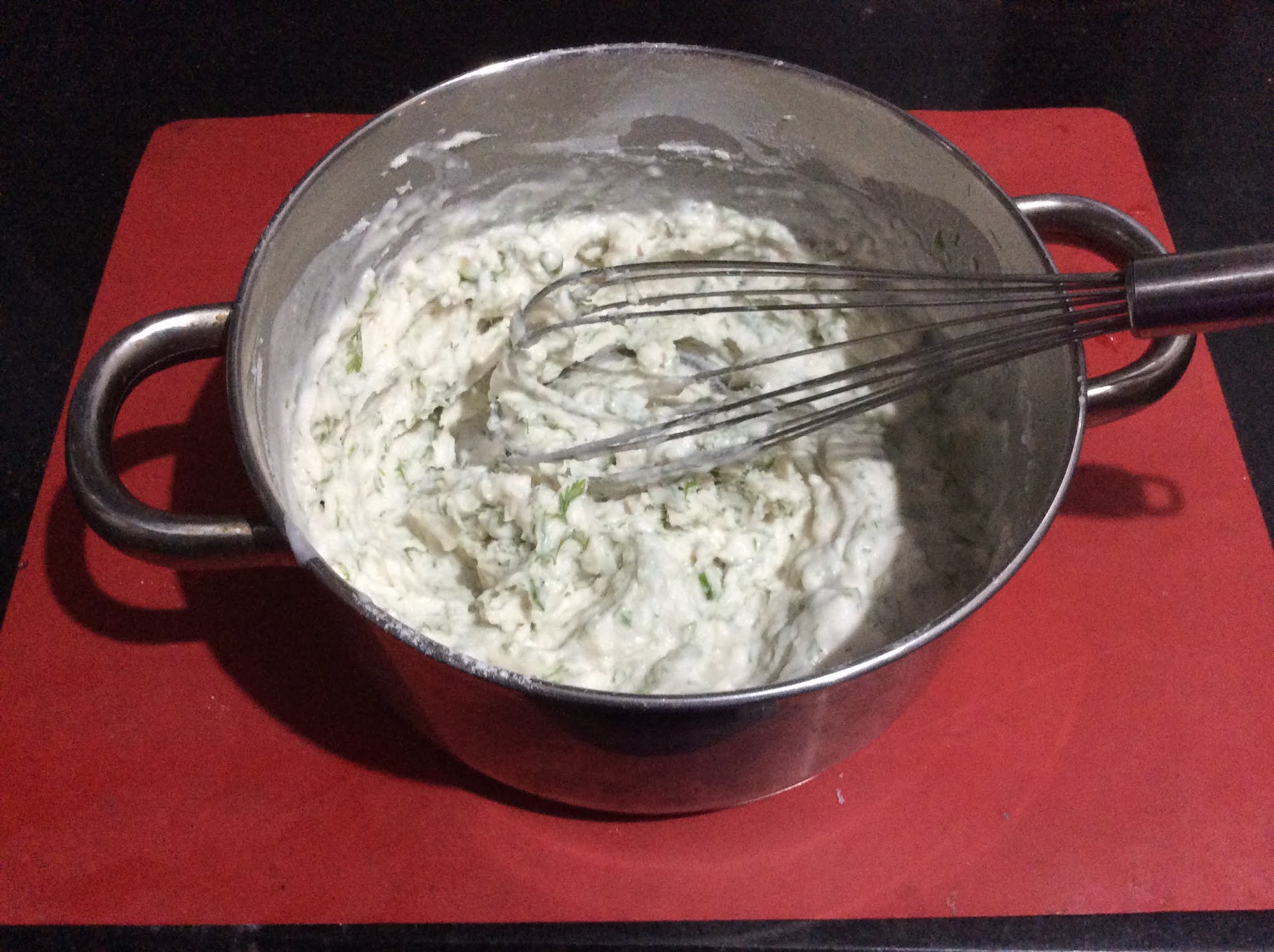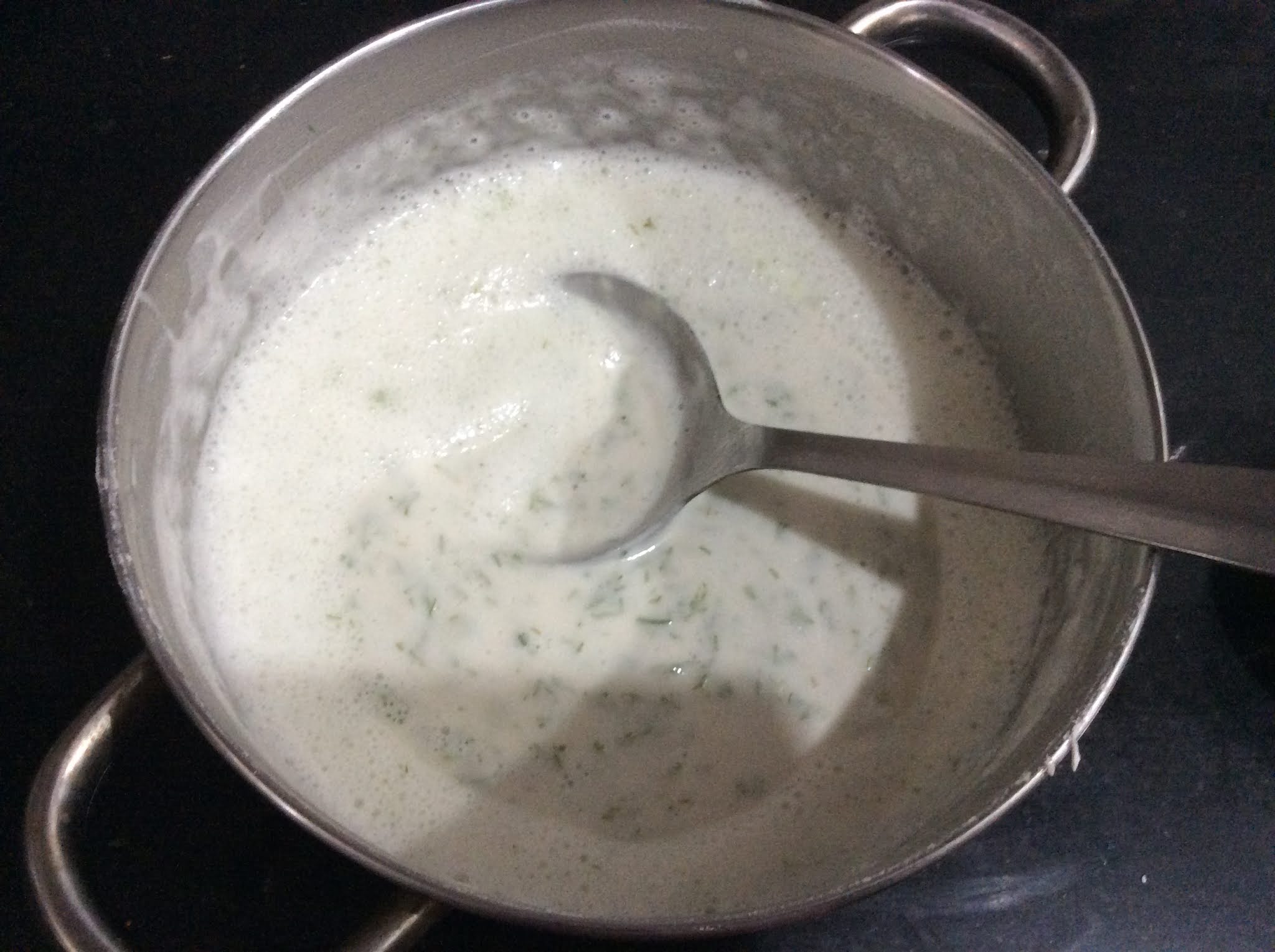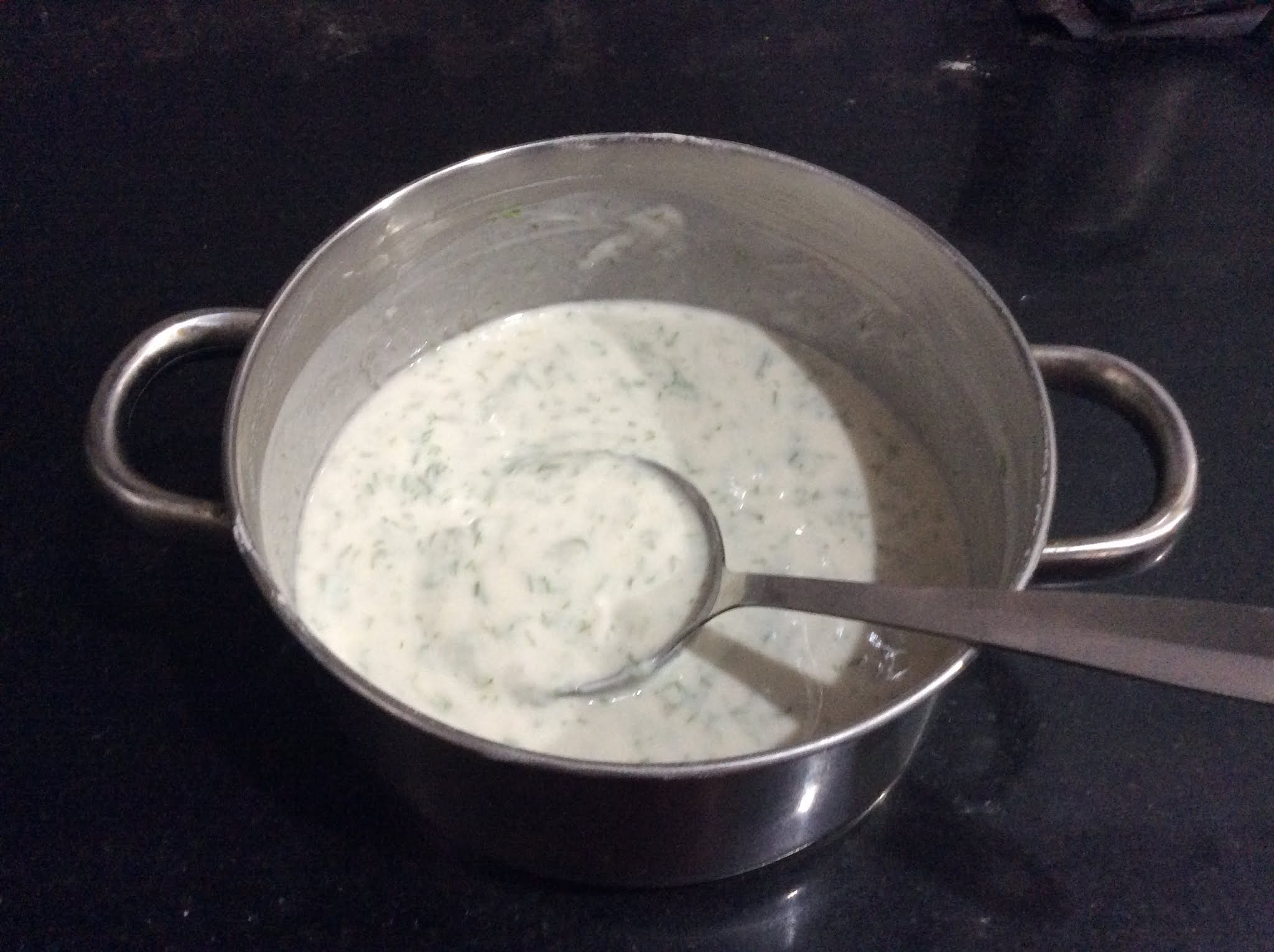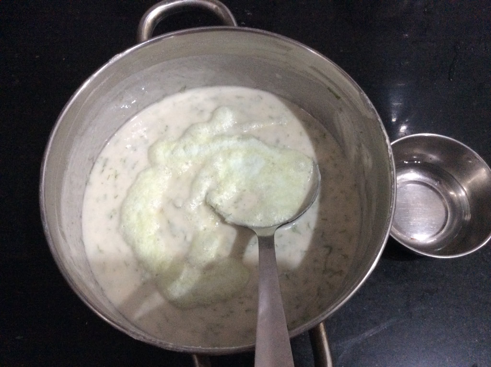 • Add Curds, Salt, Chopped Green chilies and Chopped Dil leaves to the bowl.