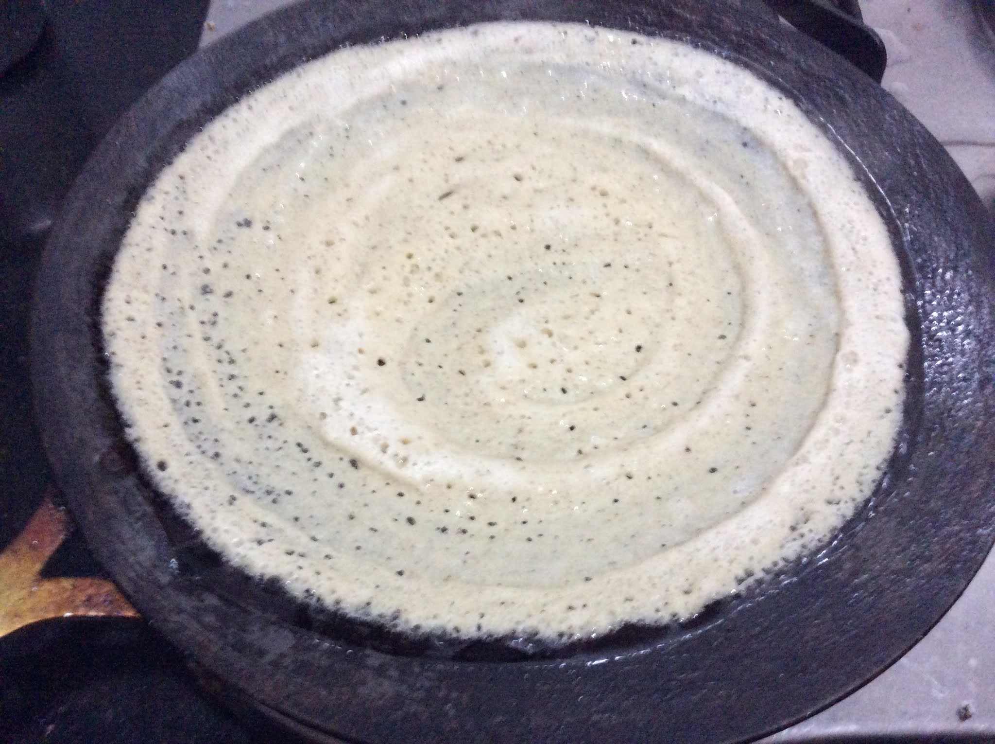 • Take a ladle full of batter and put it in the center of Tawa.
