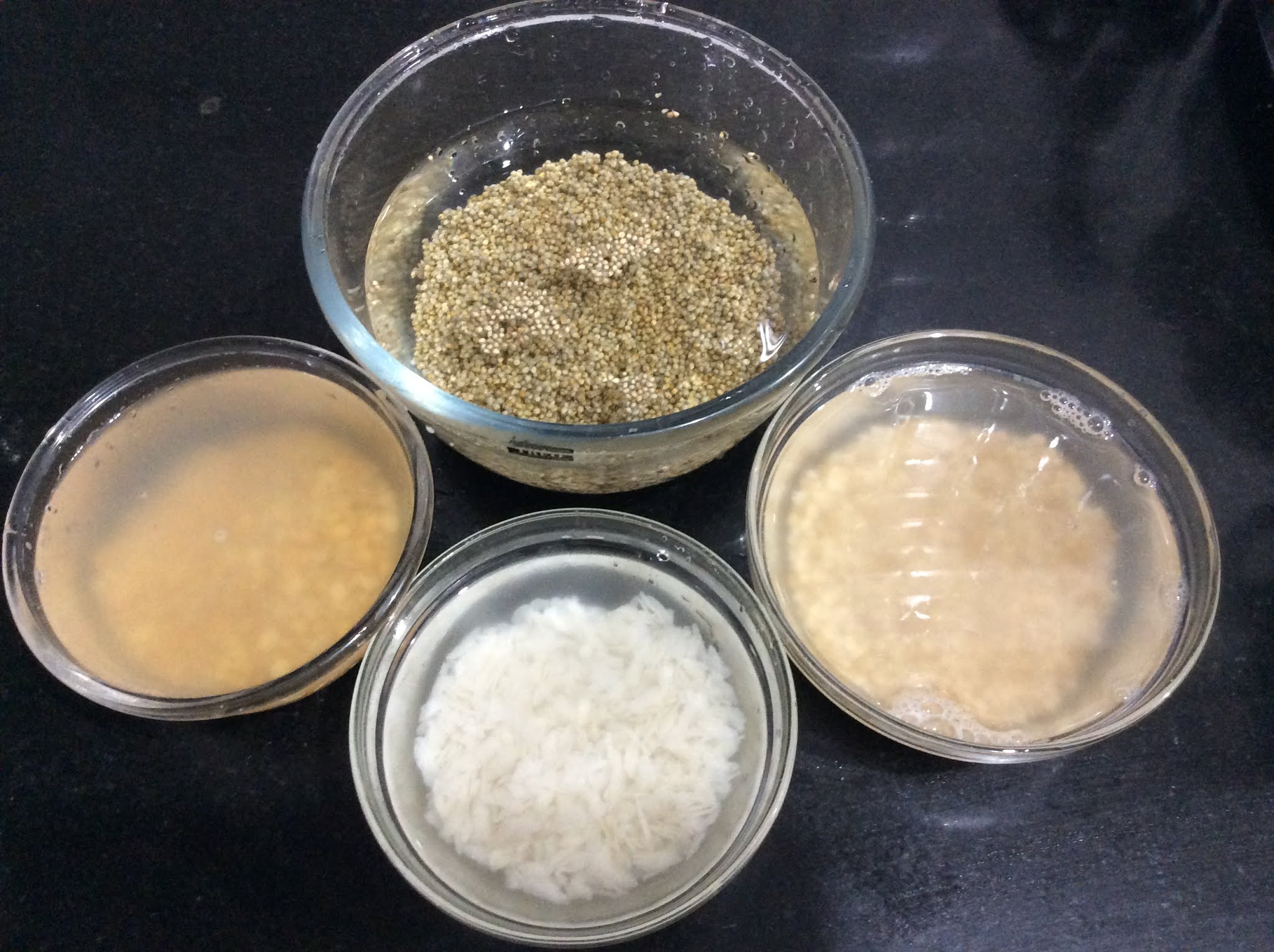In this Dosa along with Pearl Millet, we will be using Chana dal, whole Urad, Tuar dal, and Poha (beaten rice). Fenugreek seeds and Salt.