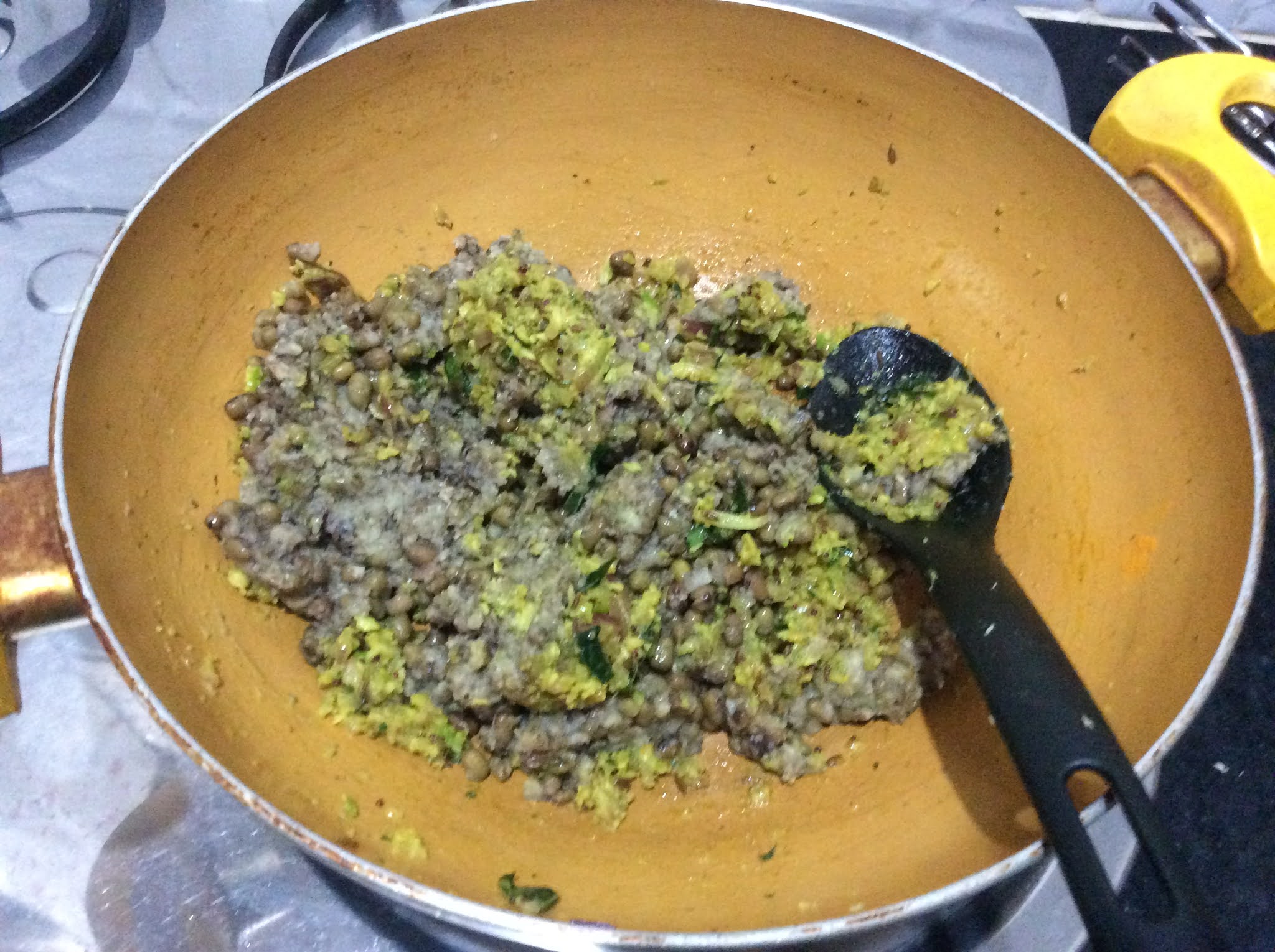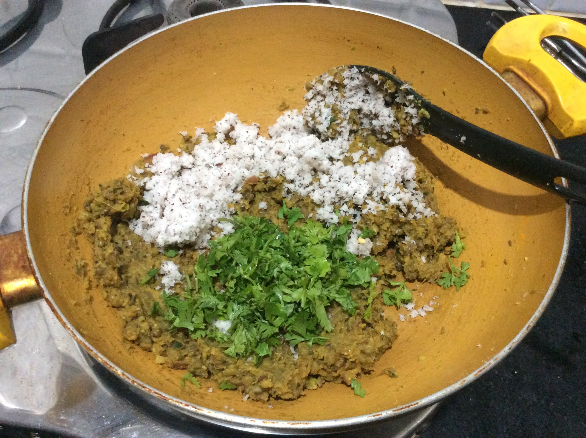 - Add grated coconut and fresh coriander leaves. Give it a good mix and the stuff is ready.
