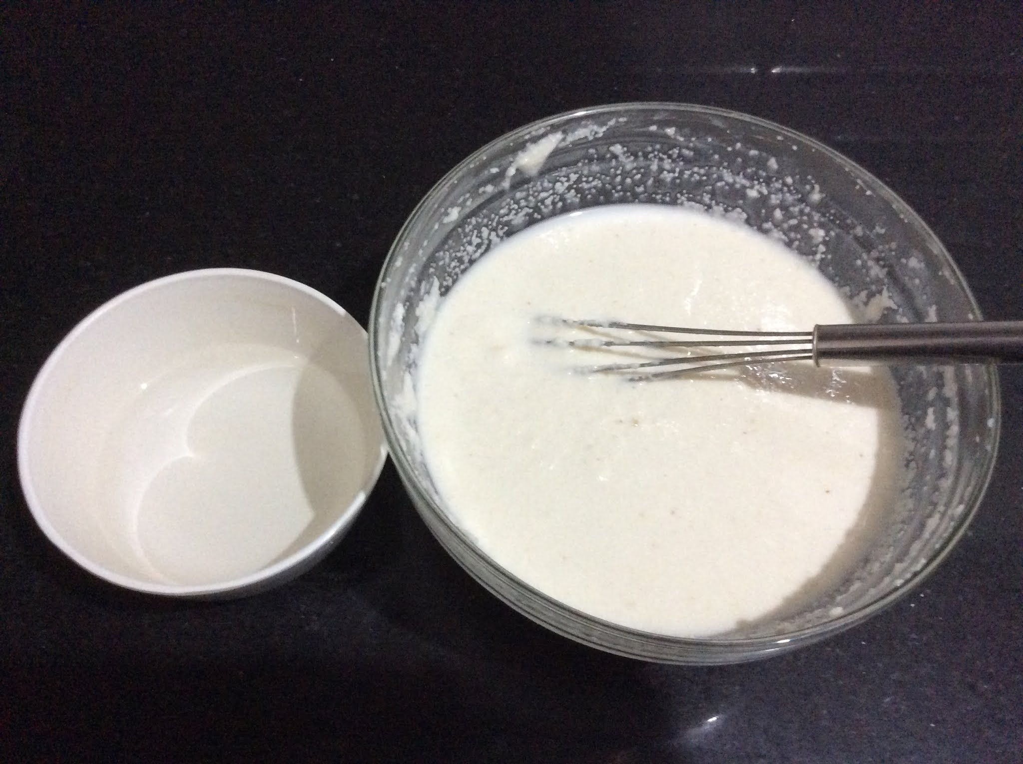 - Add 3/4 cup of water slowly to make a watery consistency of the batter.