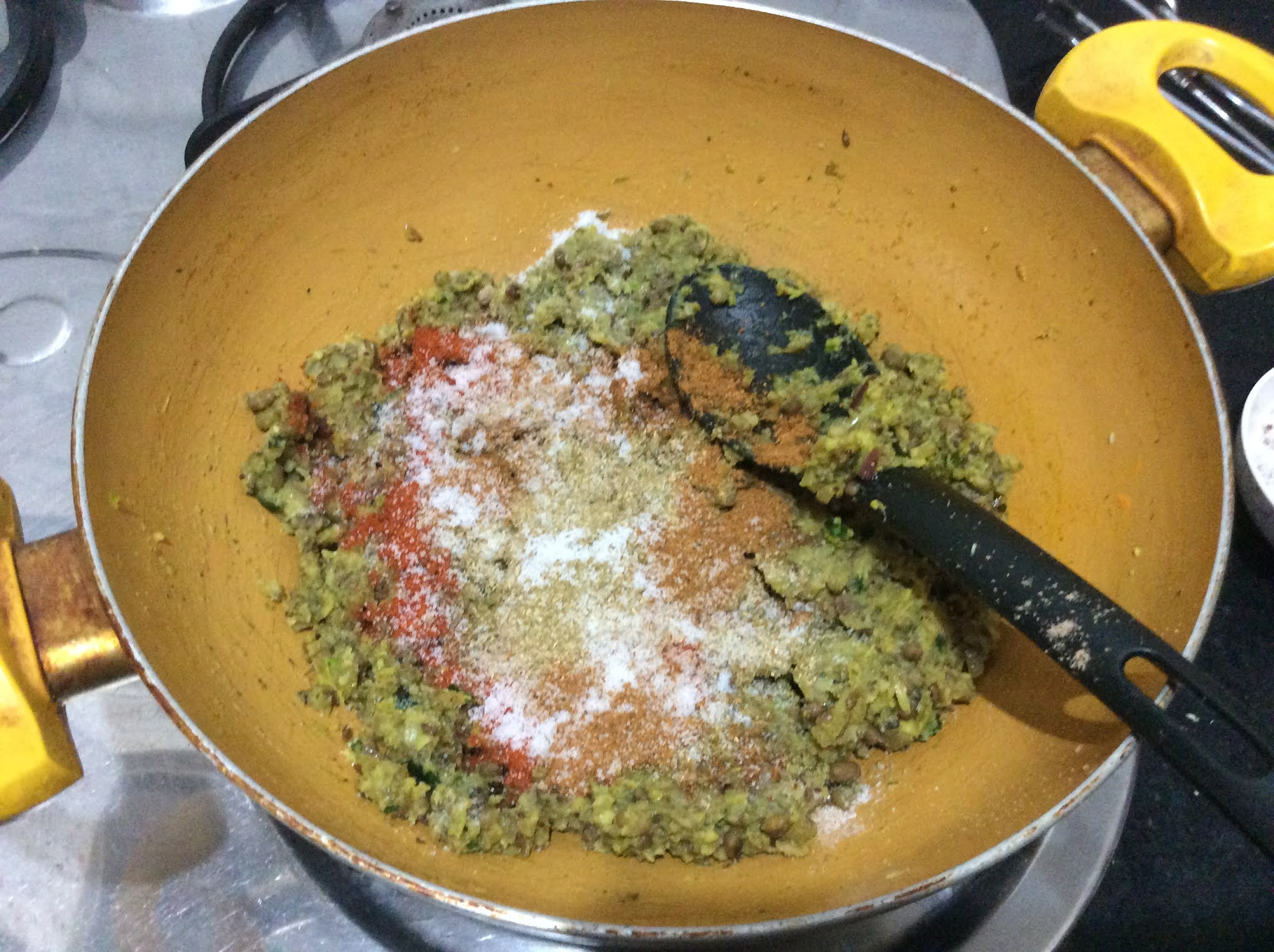 - When hot start putting the batter, 1/2 fill and put stuff (ball made out of the moong gram stuff)