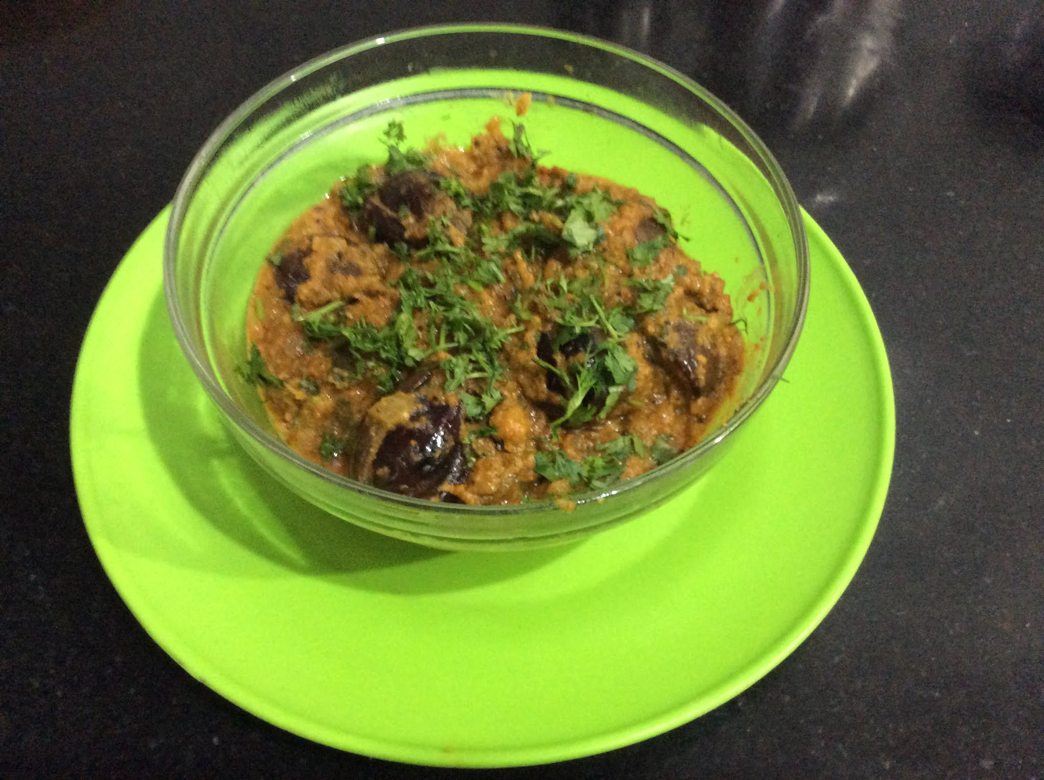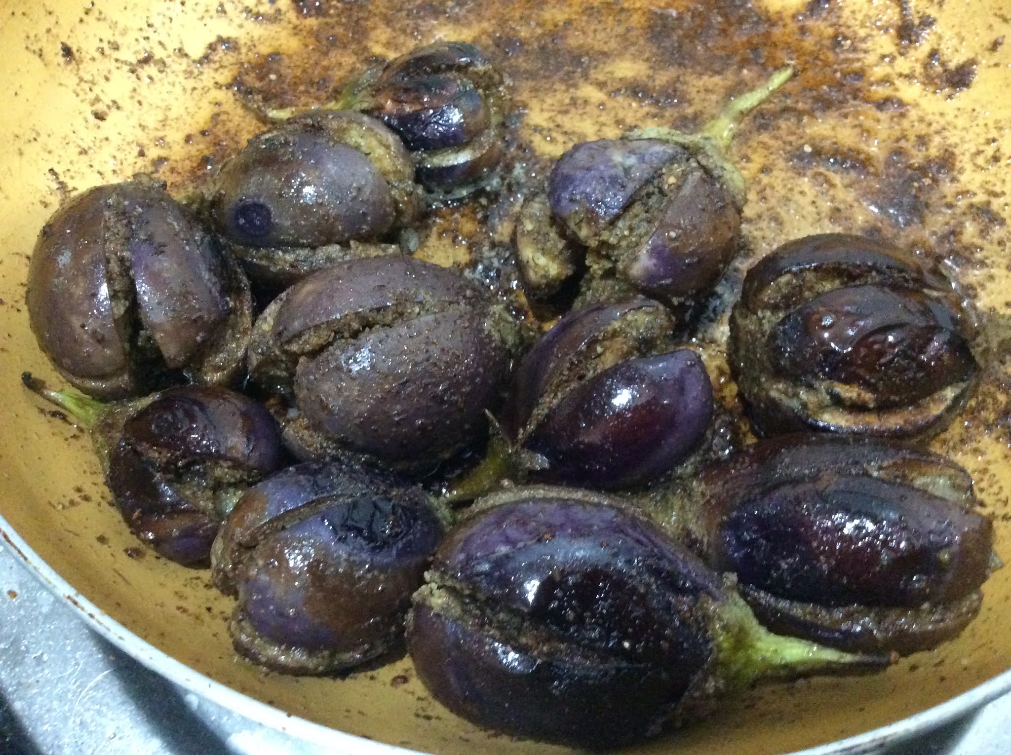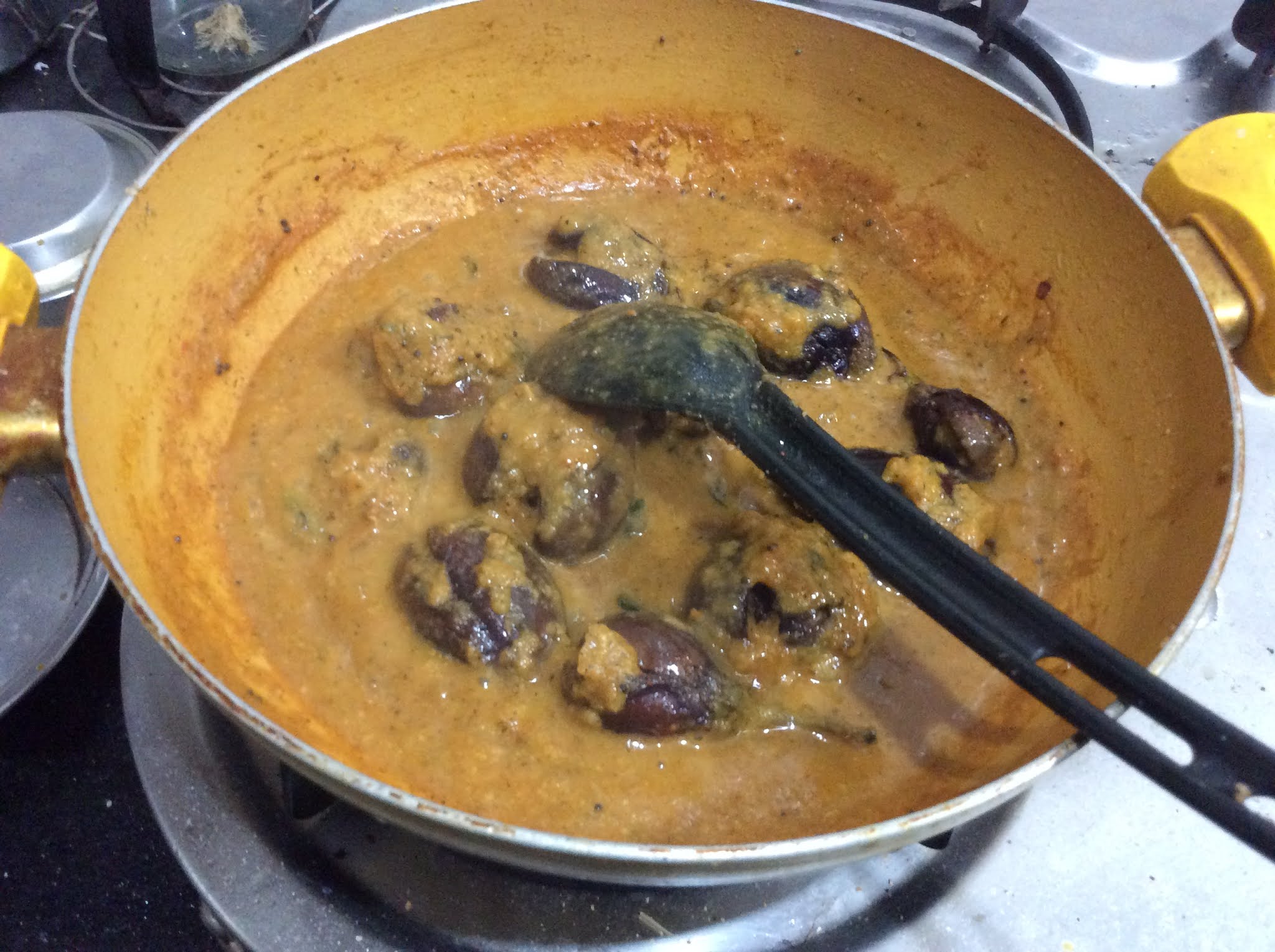 • Bring to a boil and gradually slip all the stuffed and cooked Brinjals.