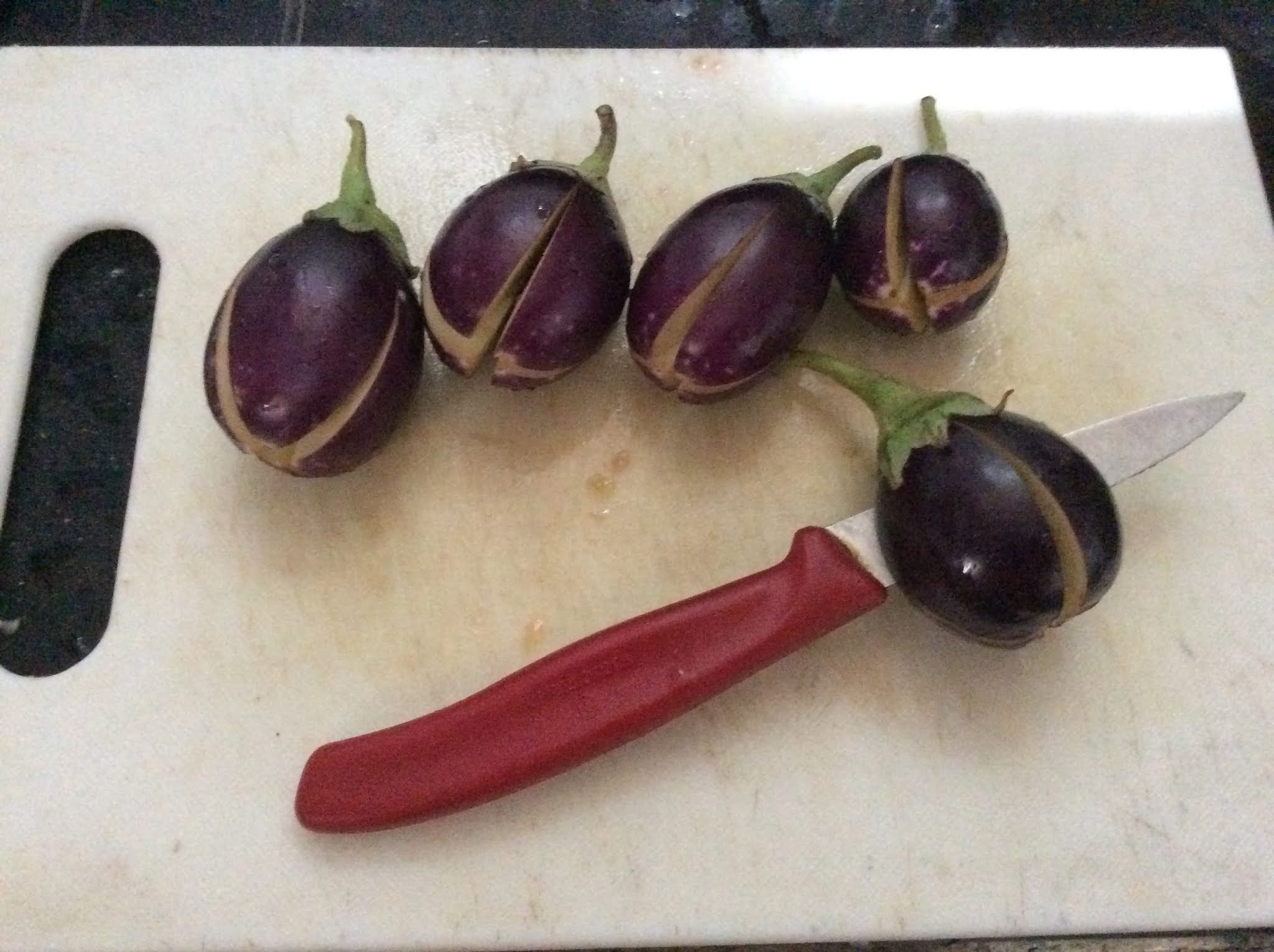 KEEP THE END INTACT SO THAT WHATEVER YOU STUFF, REMAINS INSIDE THE BRINJAL