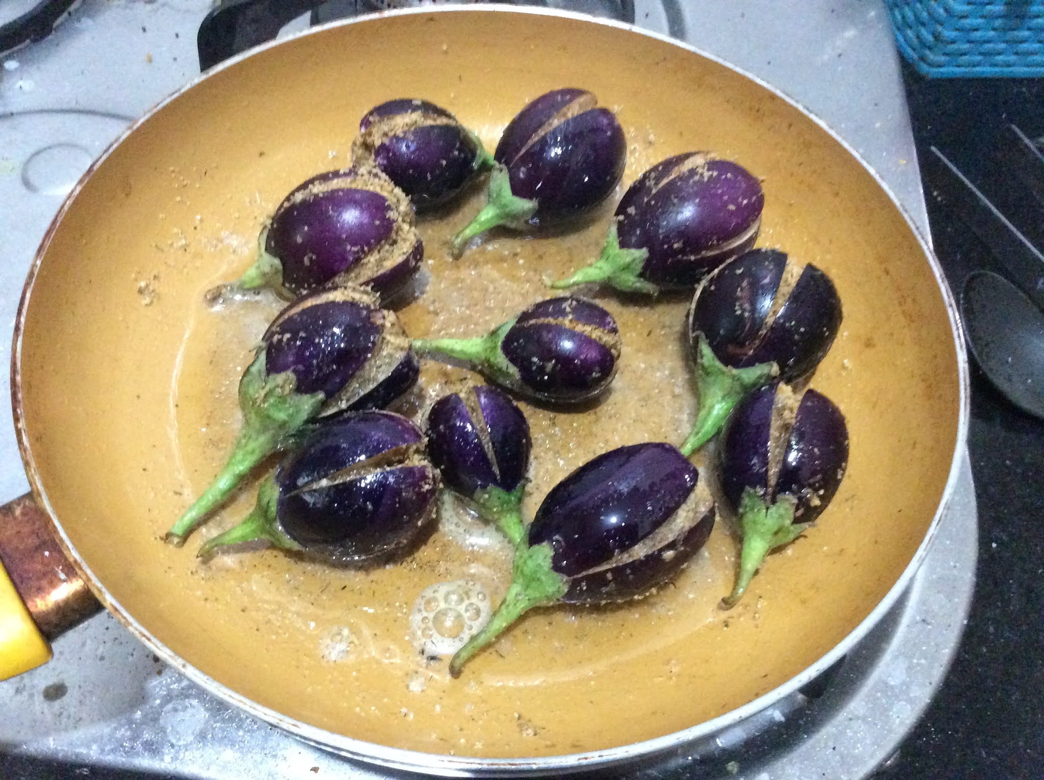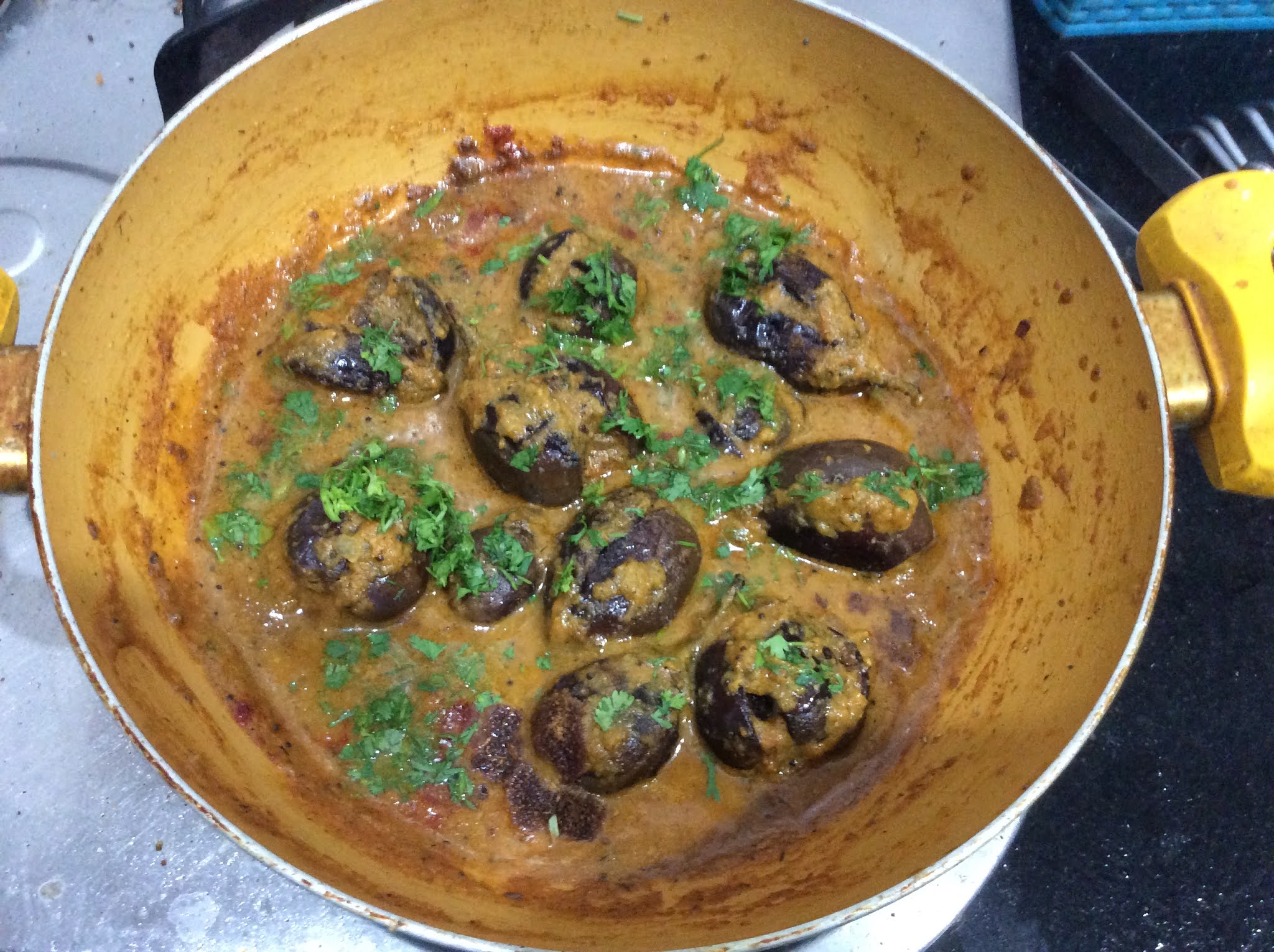 • Cover and cook for 2 mts more, stir carefully so that the stuffed Brinjals do not open up.