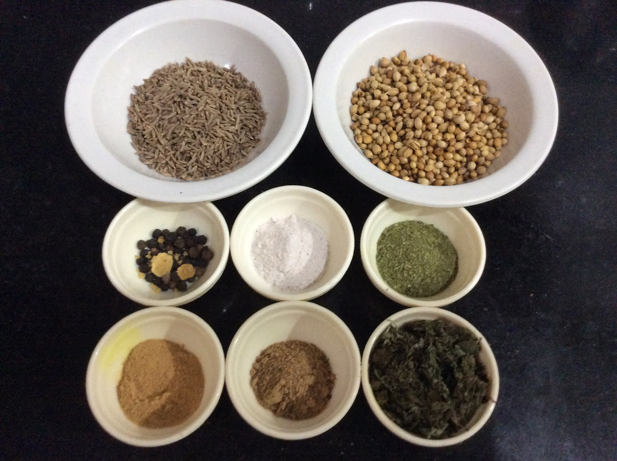 - Dry roast Cumin seeds, Coriander seeds, Black peppercorn, and Hing powder.