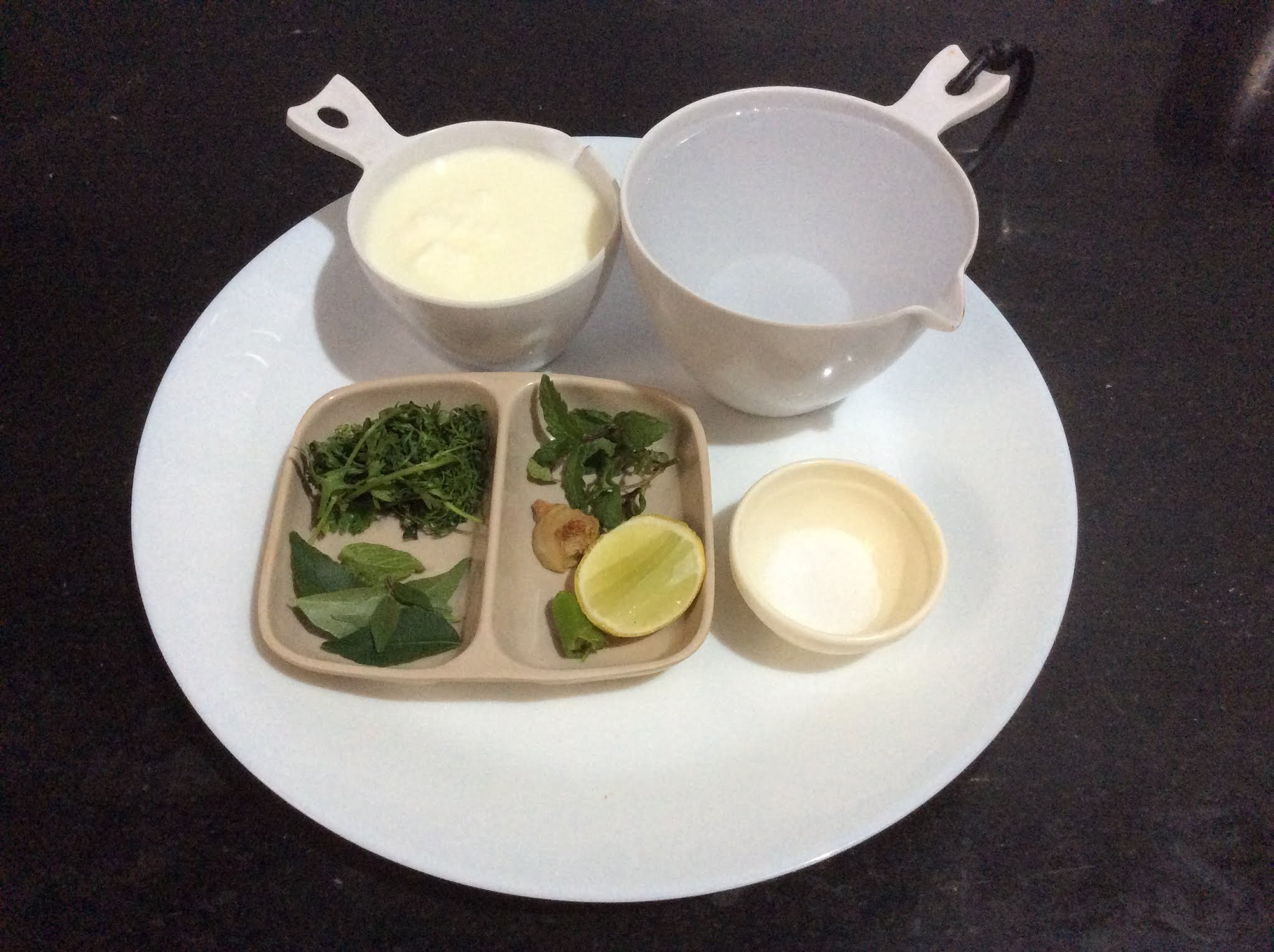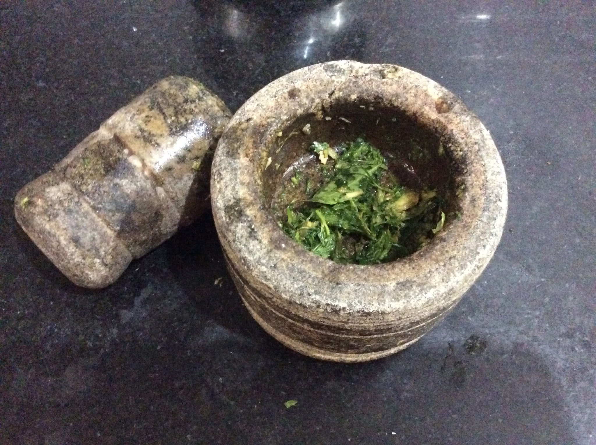 - Take, Ginger pieces, Curry leaves, Coriander leaves, Mint leaves and Green chili pieces in a stone pounder, and with the pounding stone crush it to a coarse paste.