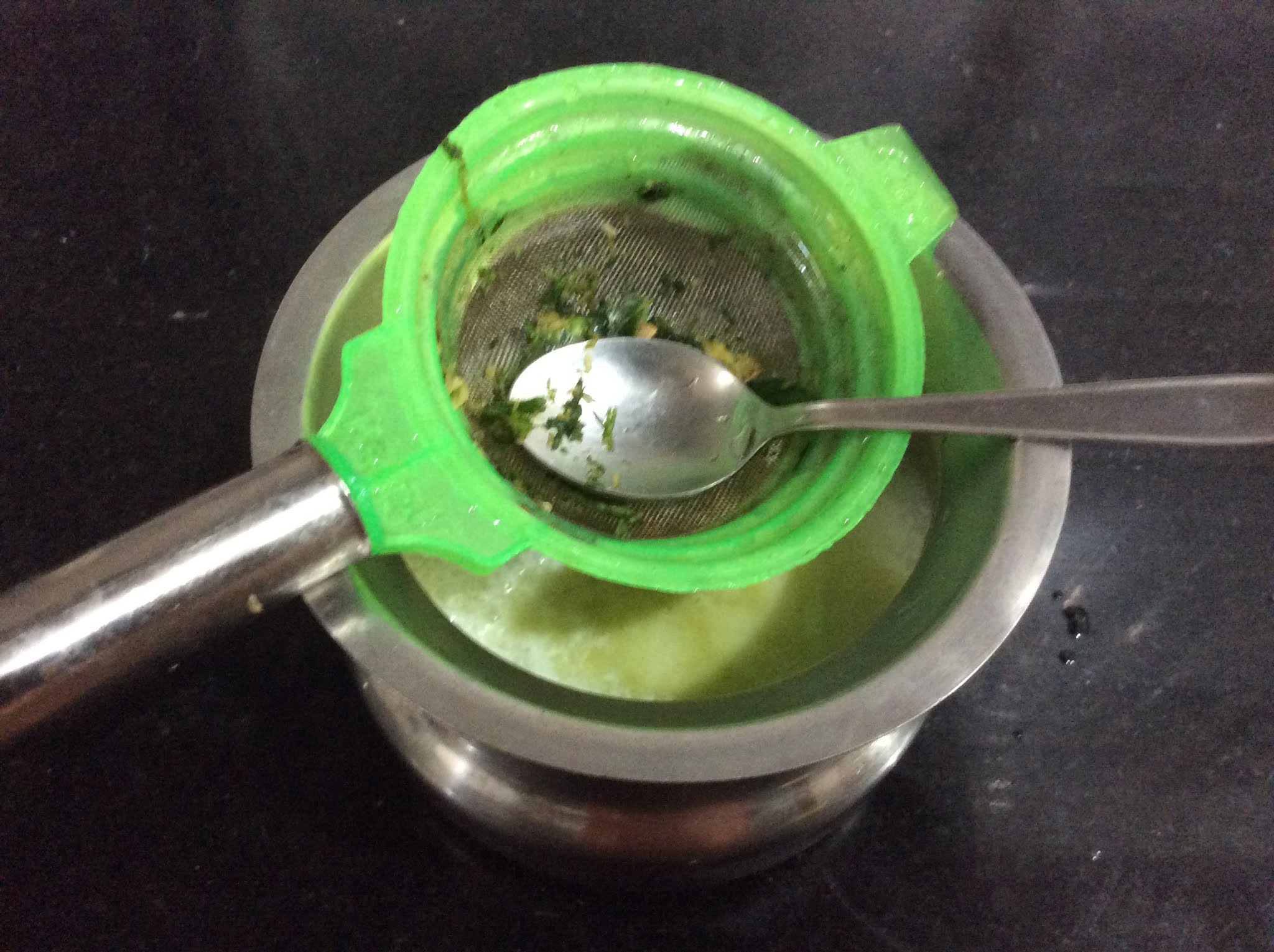 - Put some water in it and mix, pour that in a strainer, into the BUTTERMILK, you just made.