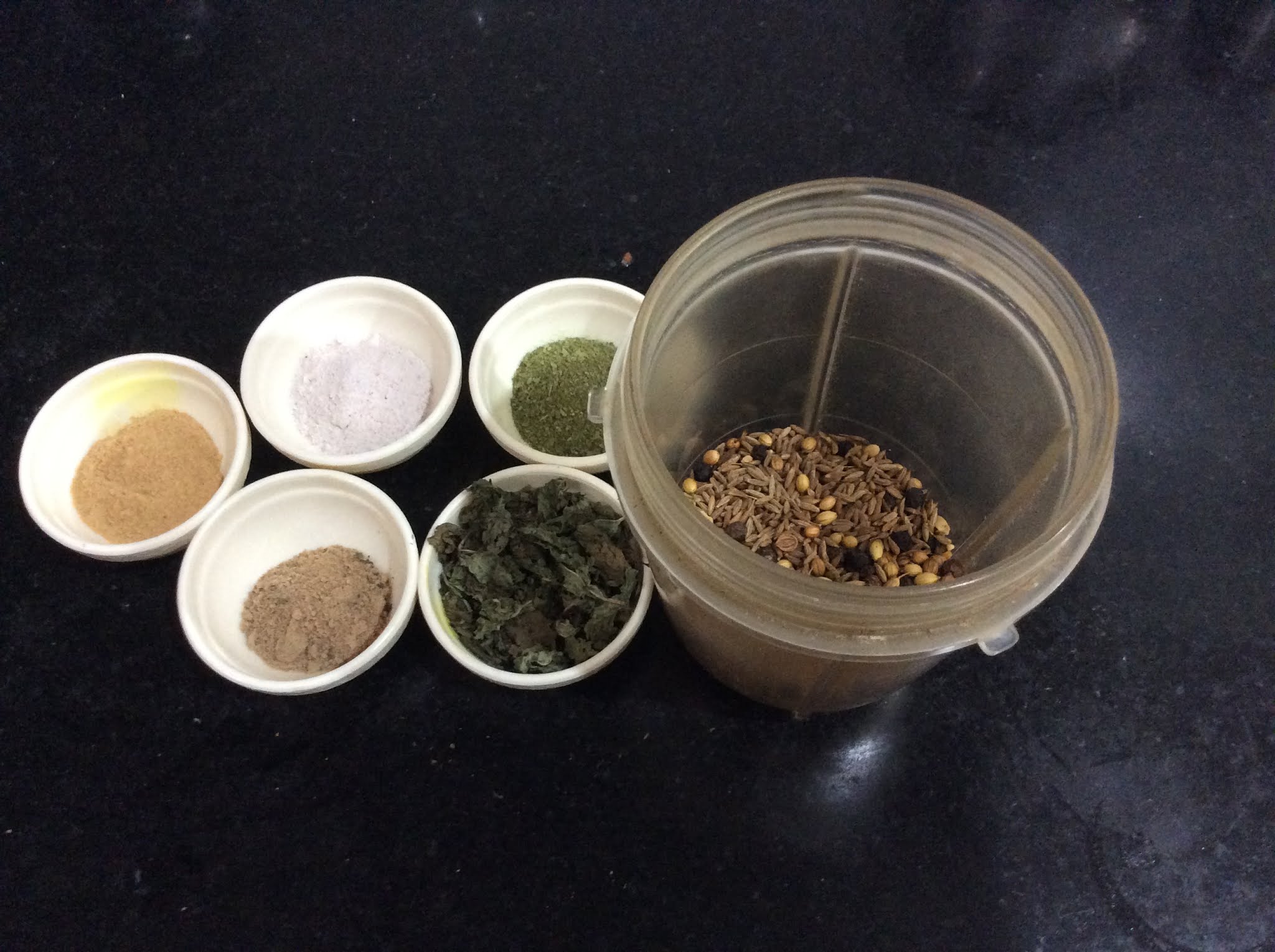 - Now add other ingredients such as Dry ginger powder, Black salt, Aamchur powder, Dry curry, and mint powders.
