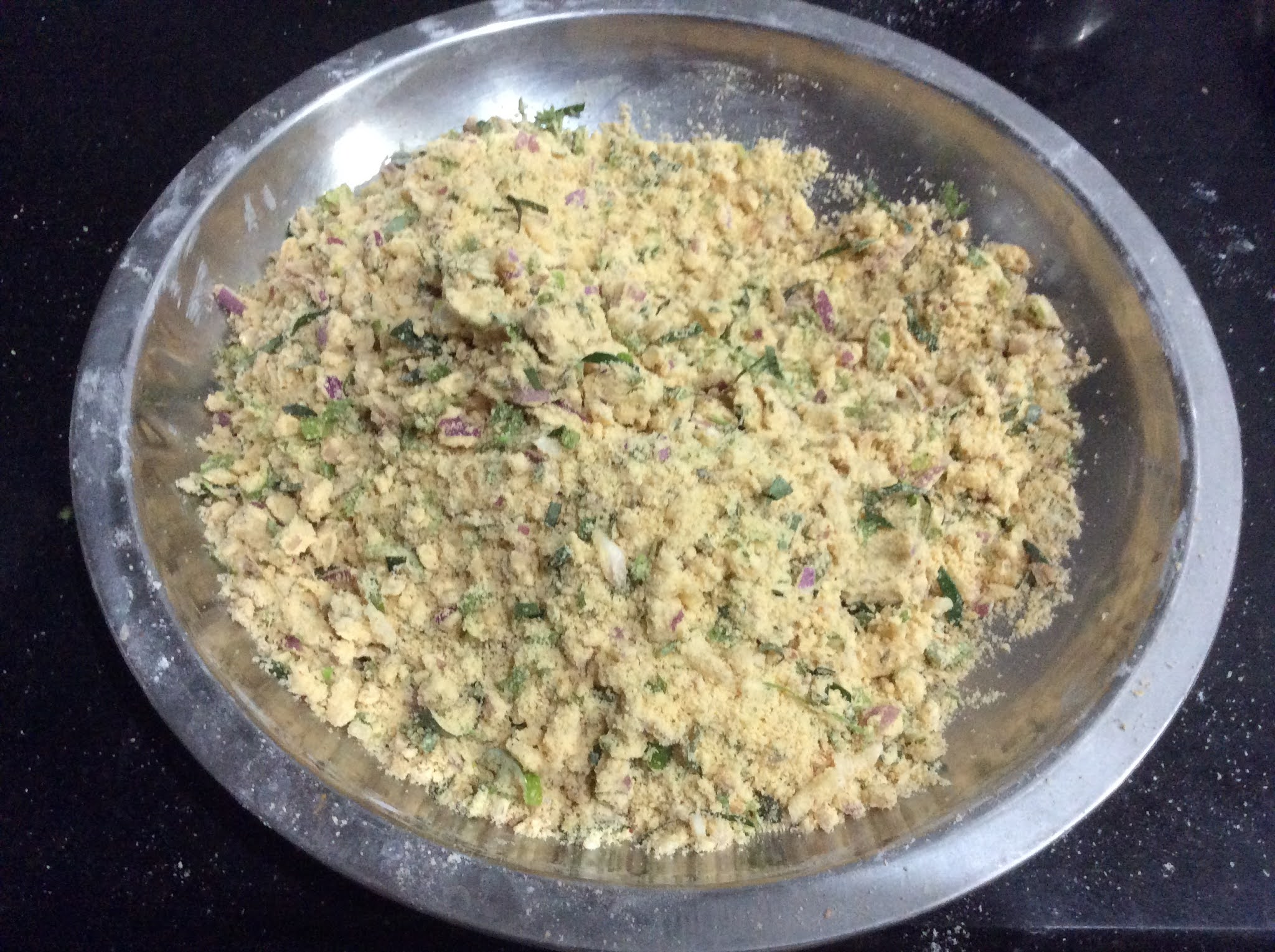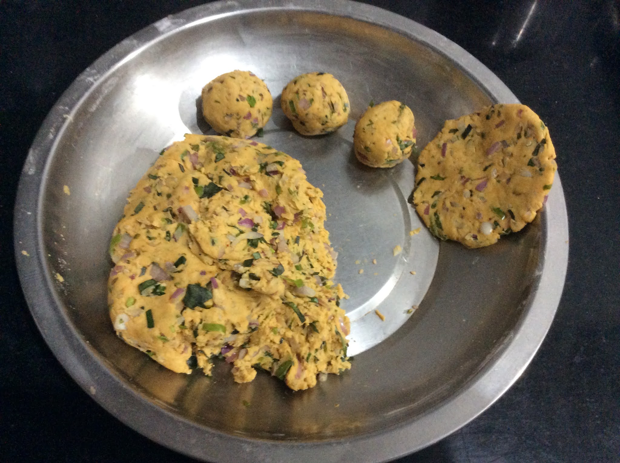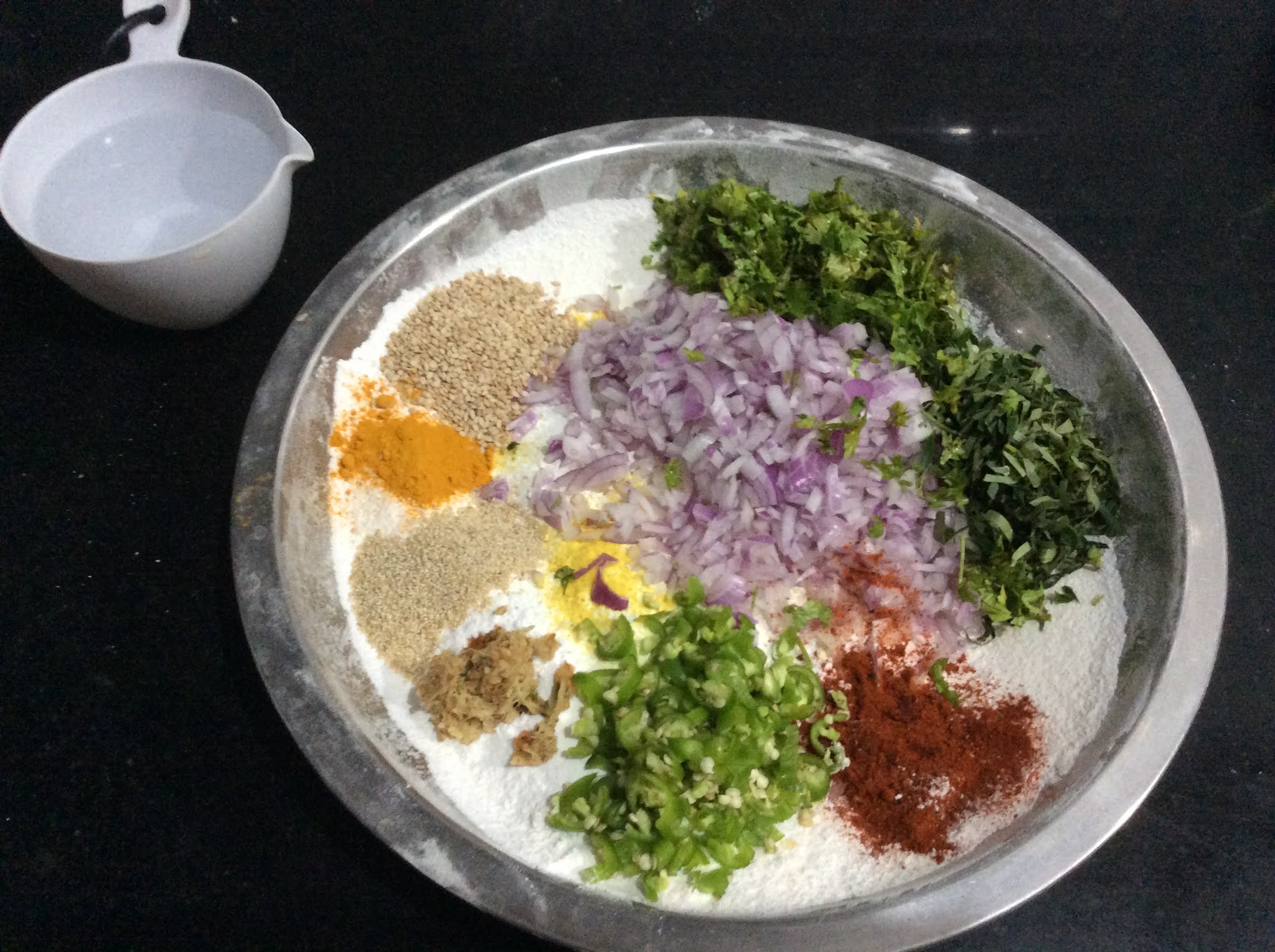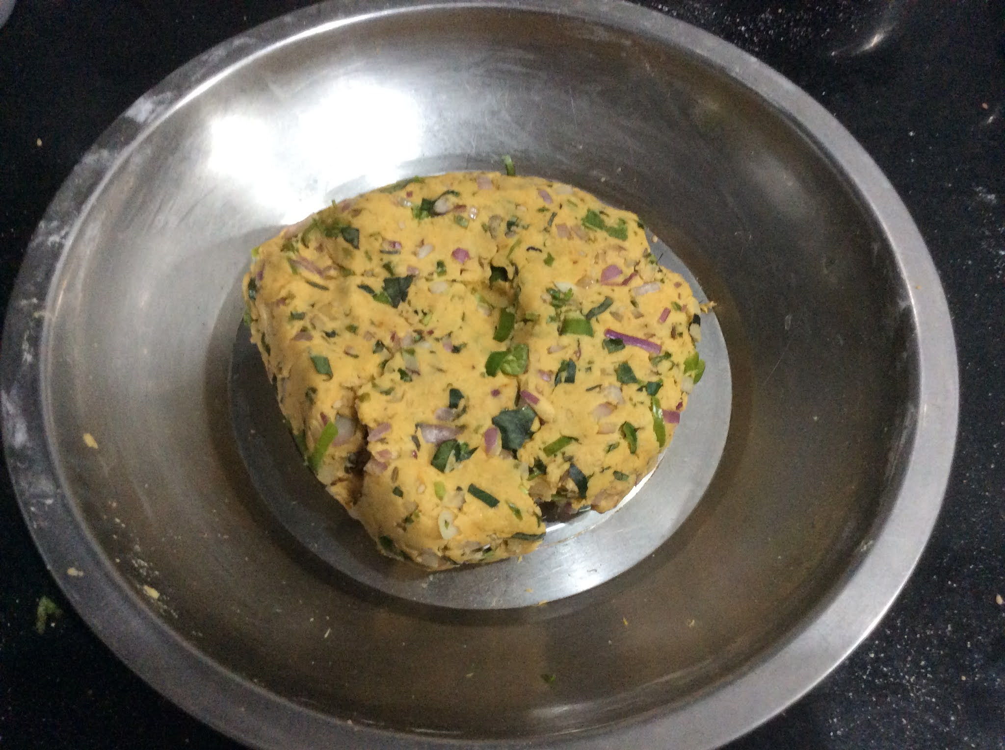 - Now add little water and make a stiff dough. (because due to onions the dough becomes loose)