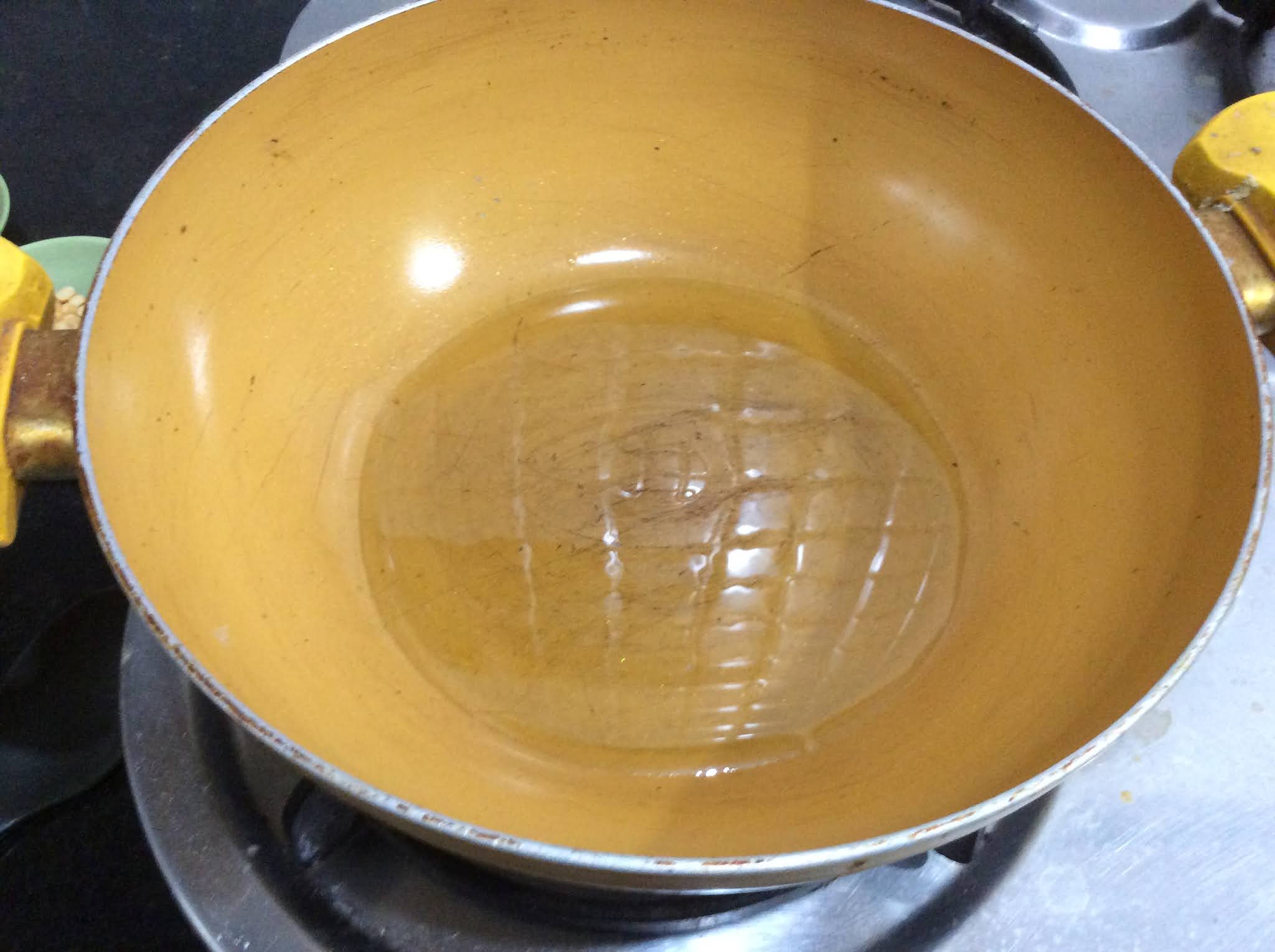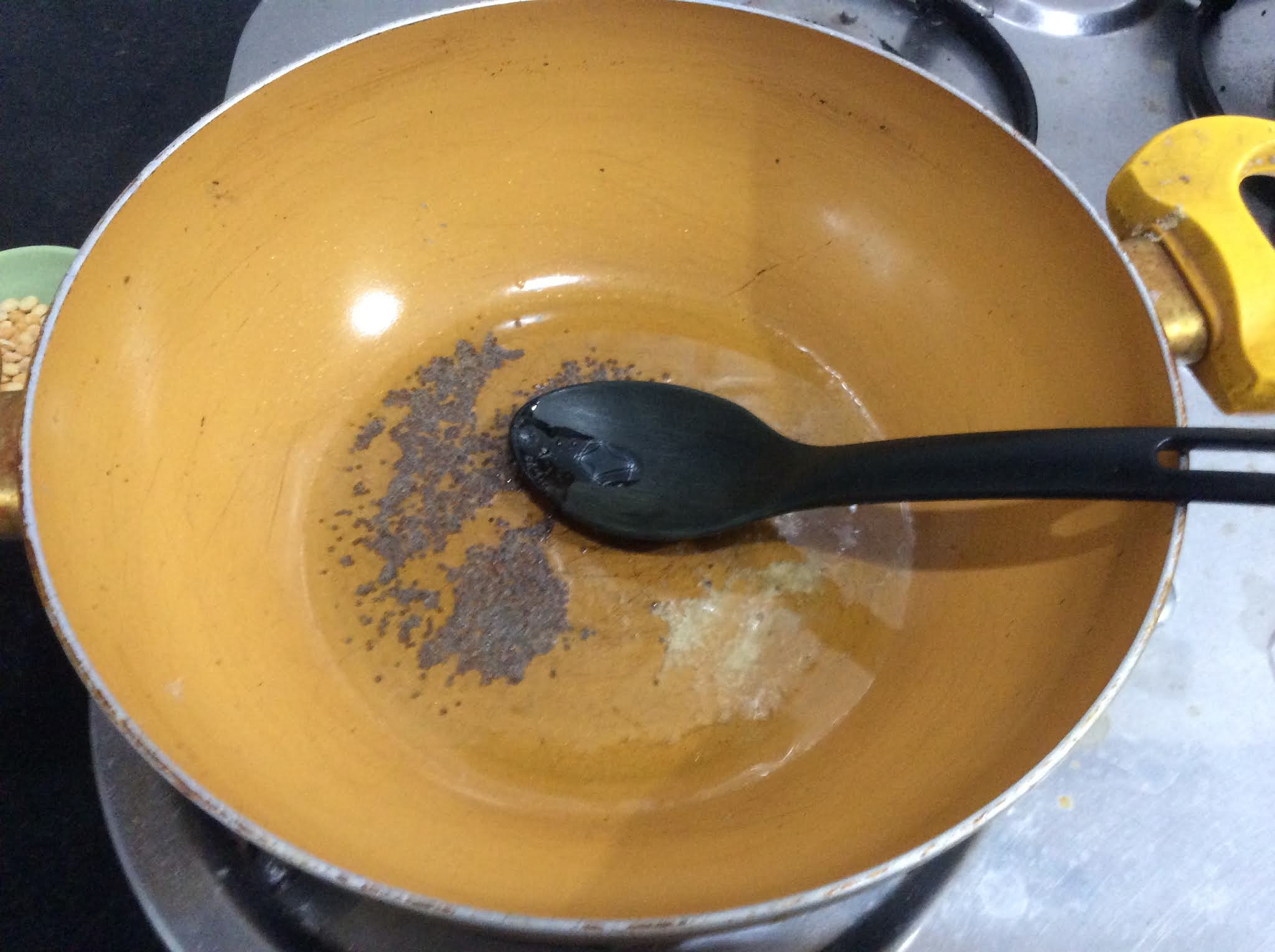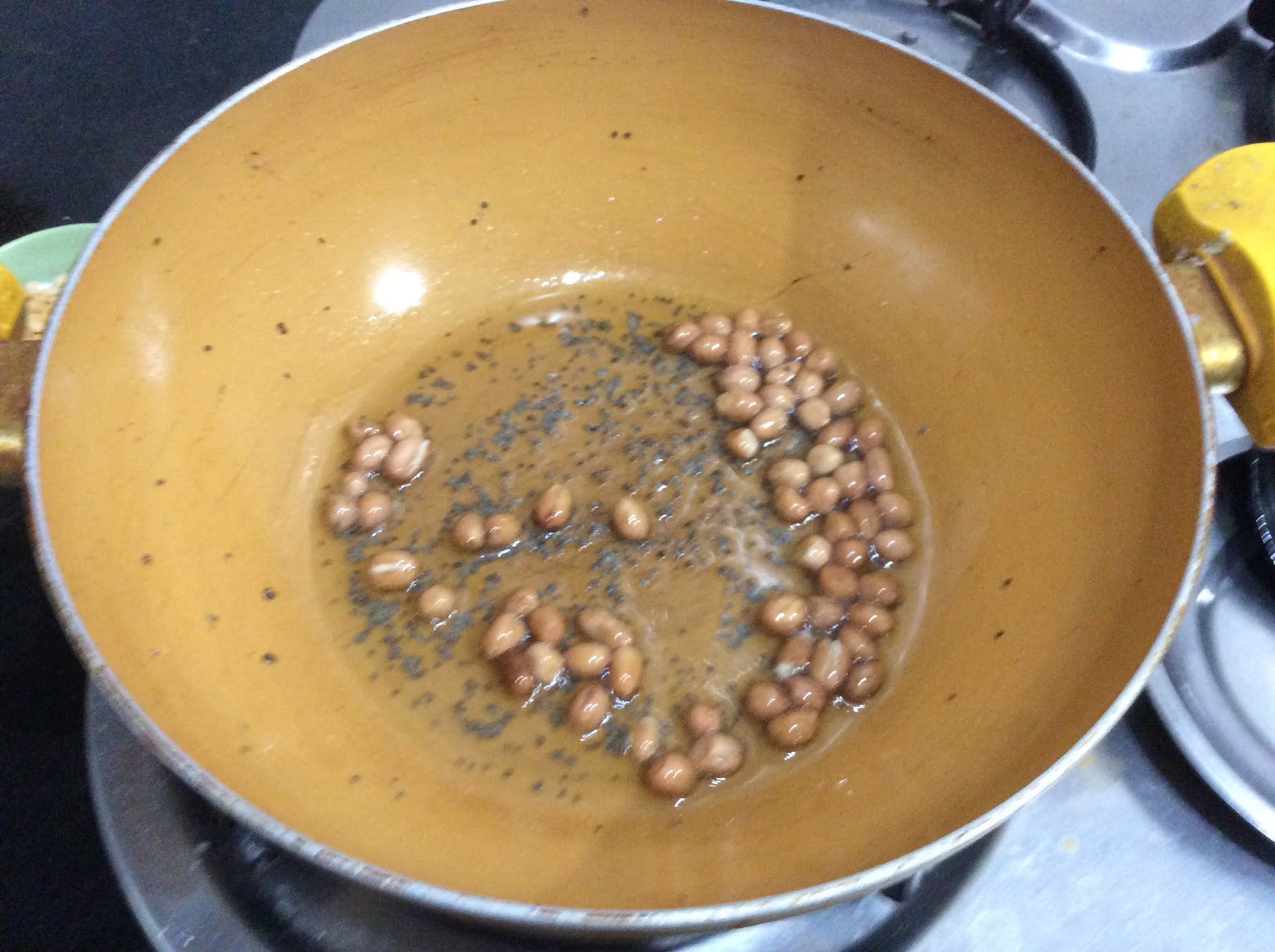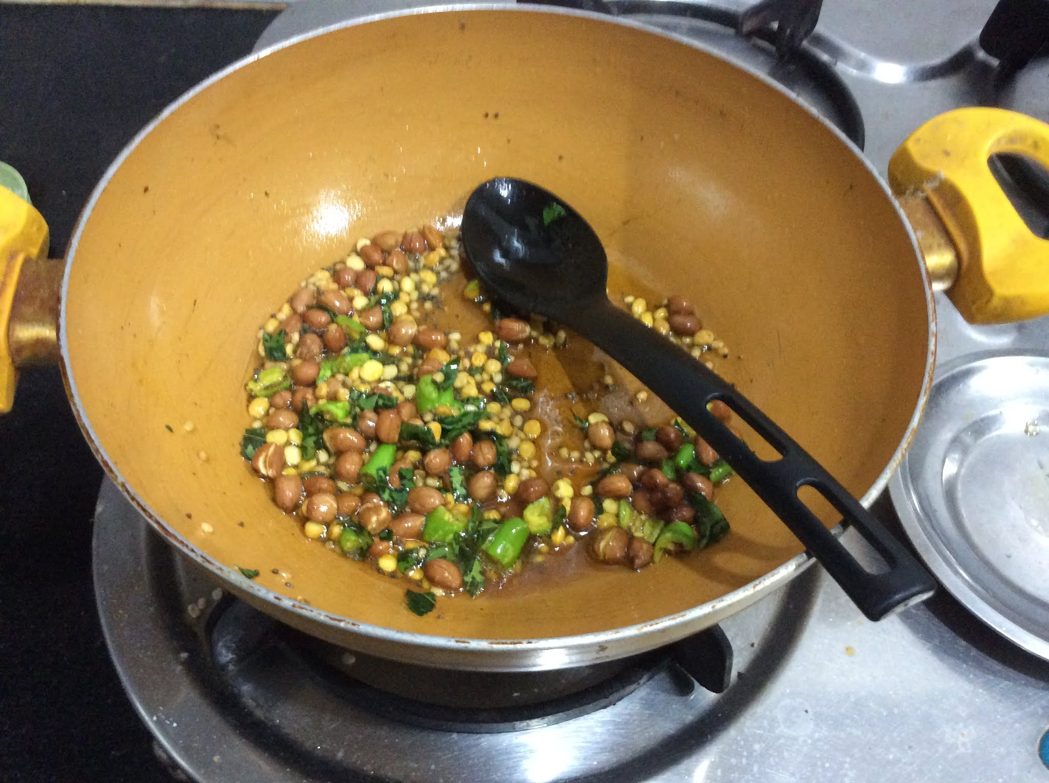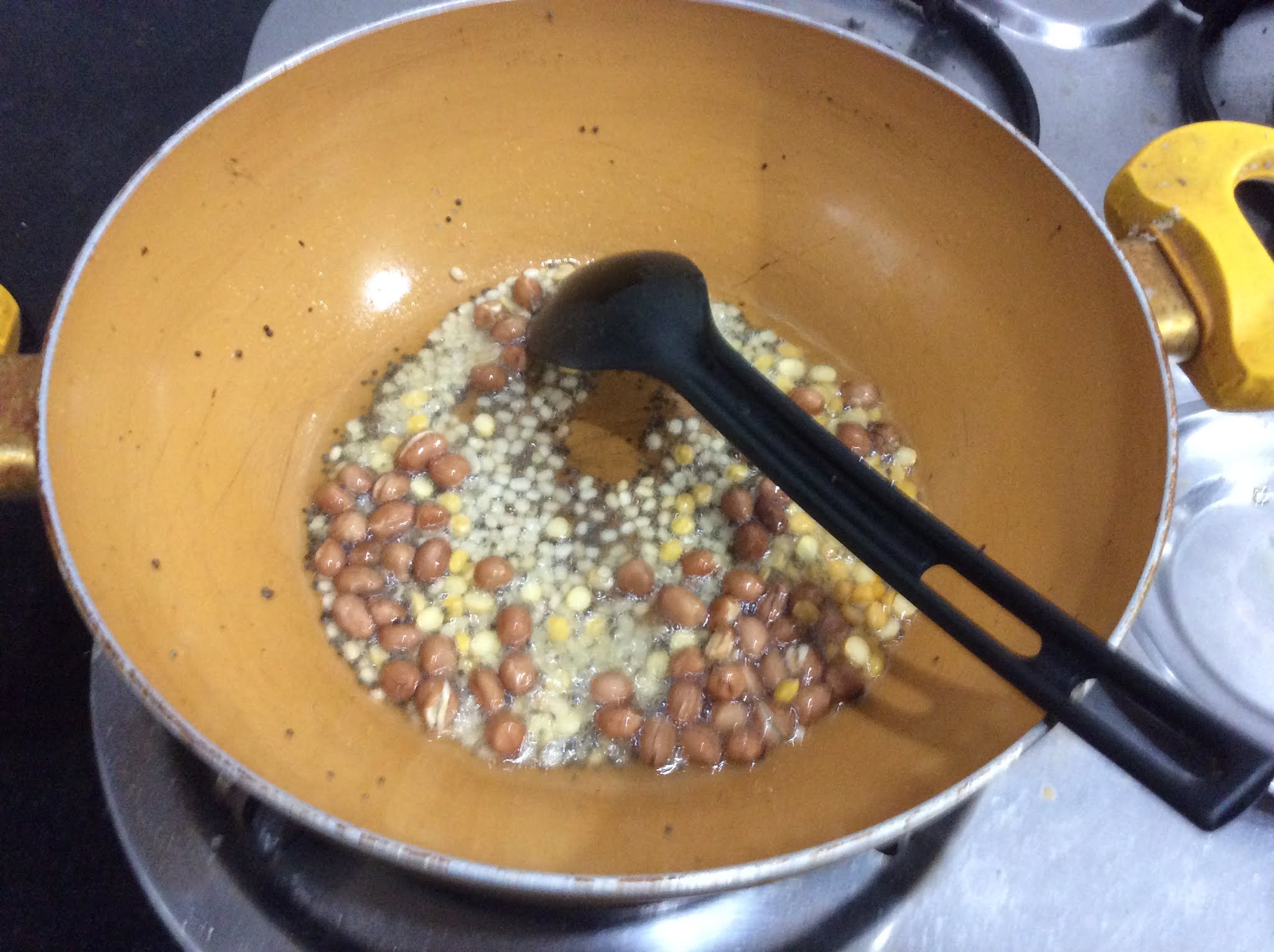 - When peanuts are 1/2 done, add Chana dal and Urad dal.