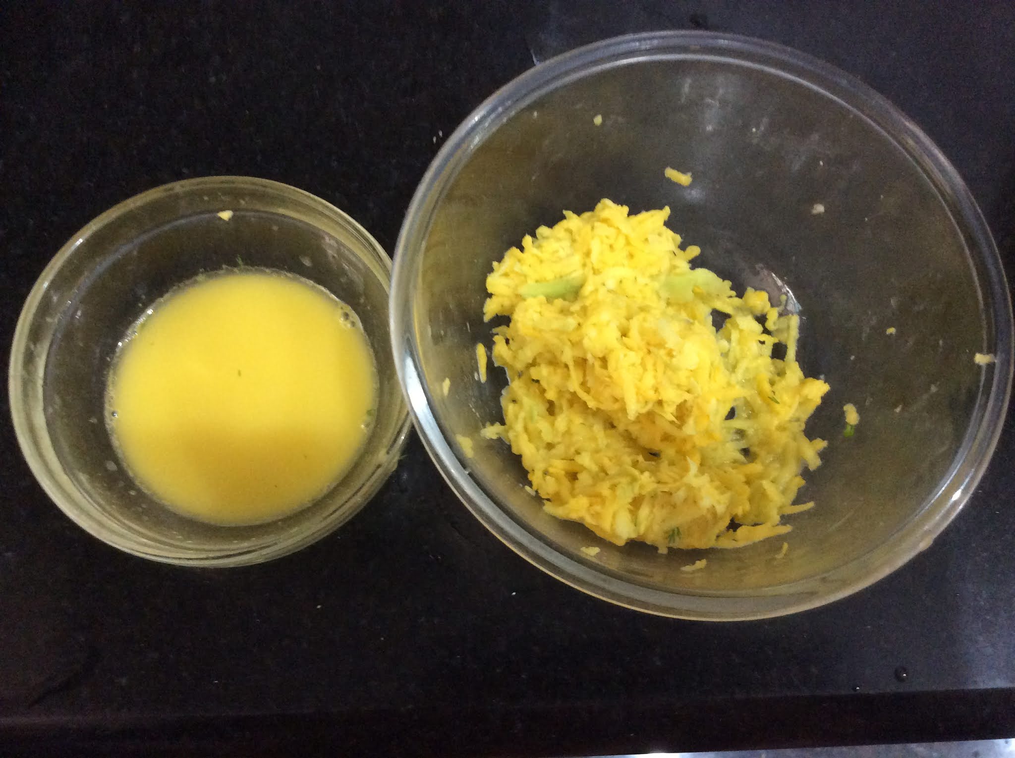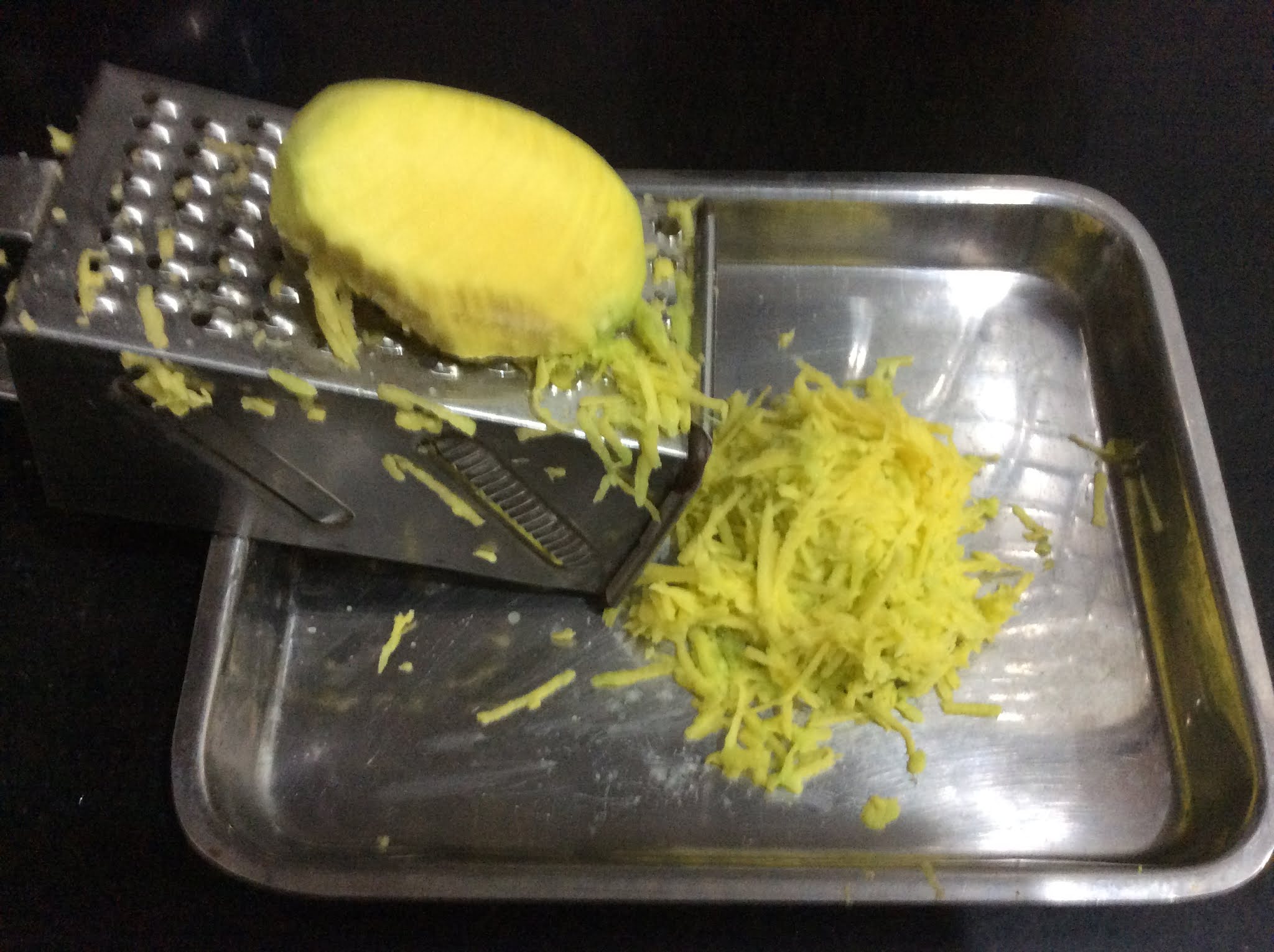 - Now take the mango gratings from the bowl in your fist and squeeze to get the juice.