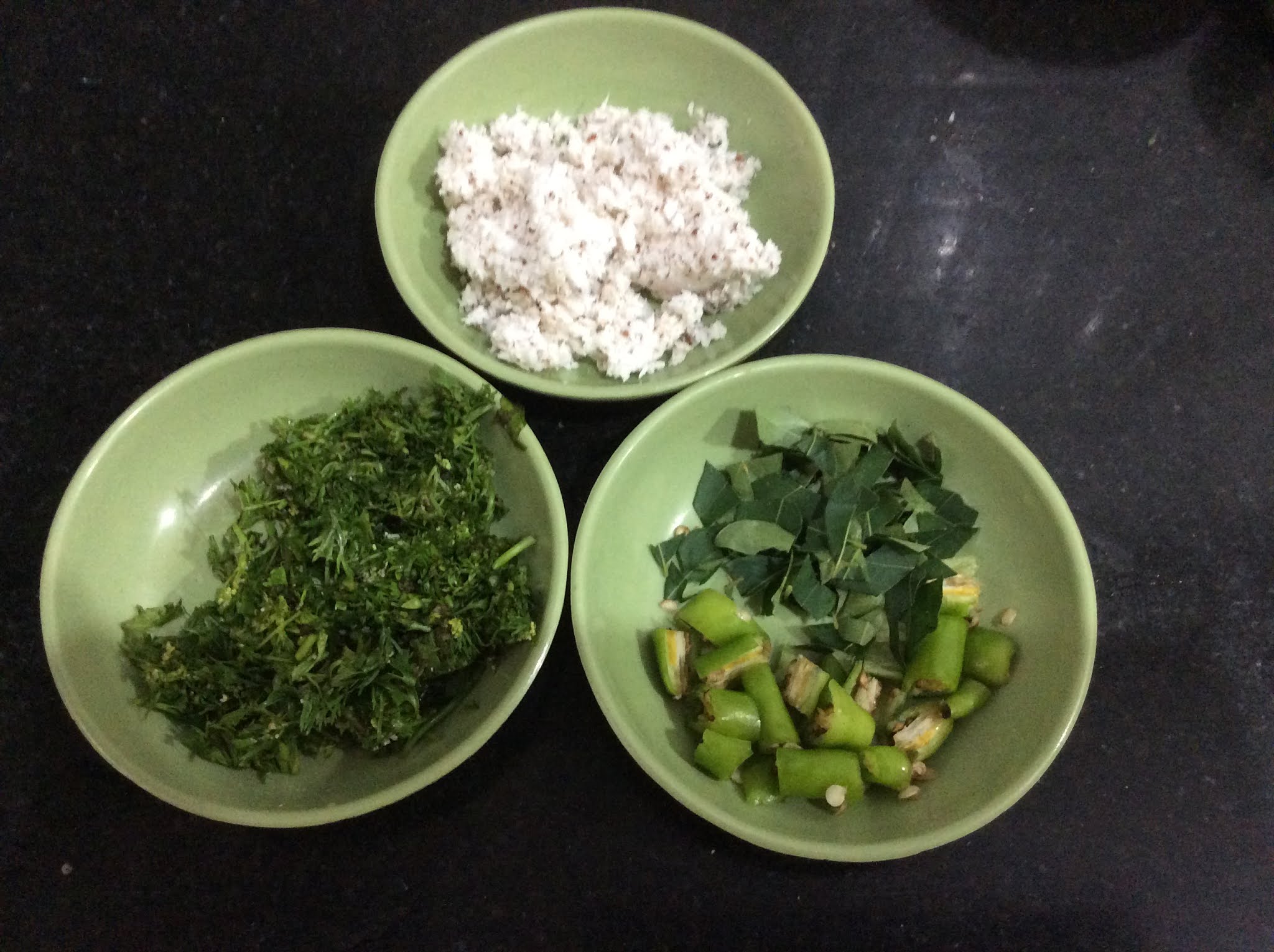 - Cut green chilies, Curry leaves and Coriander leaves.