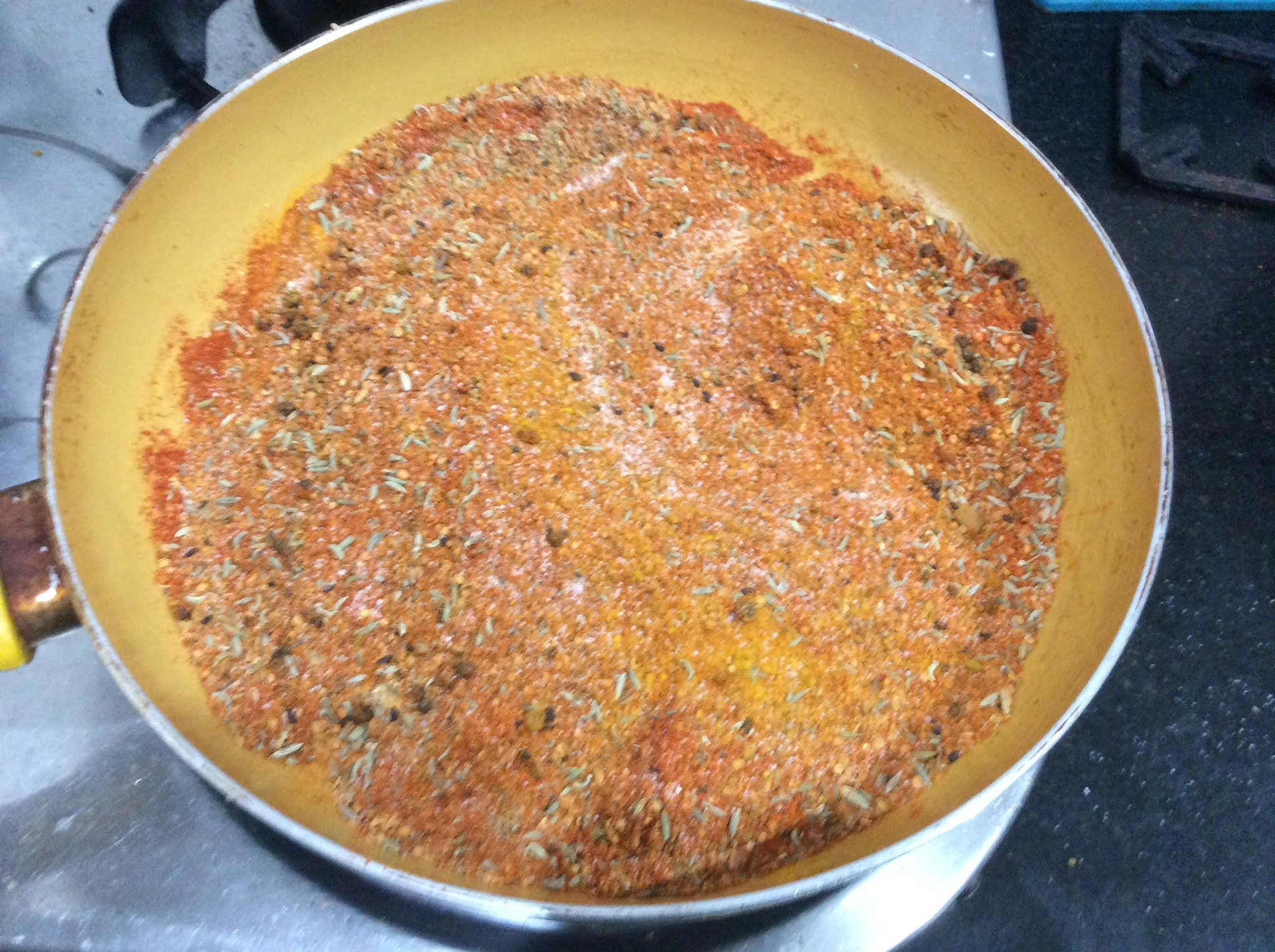 - Now mix all other ingredients such as Salt, Chilly powder, Turmeric, Asafoetida, and Cumin powder. Mix ground spice coarse powder, and also the 1/3 remaining whole roasted spices.