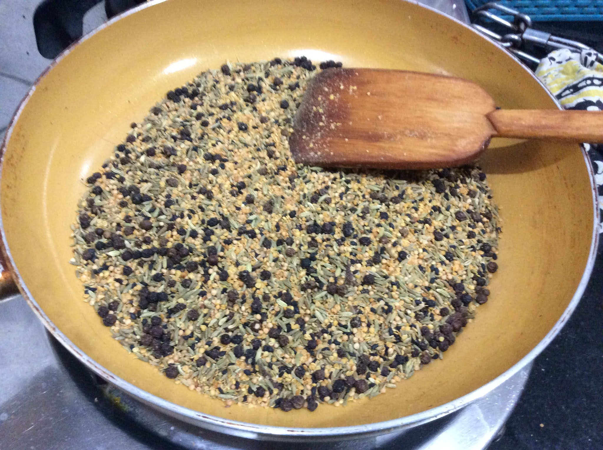 - Add all the whole spices, namely-Fenugreec seeds, and fennel. seeds, mustard seeds, Black peppercorns, and Cloves. (except Nigella or Kalonji)