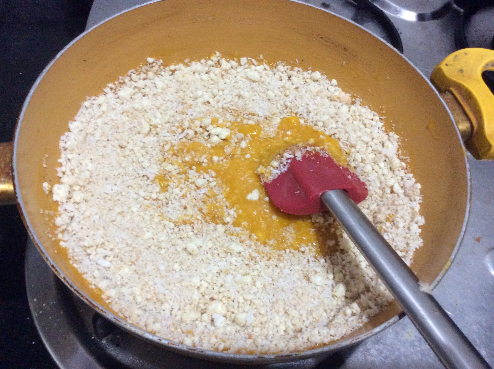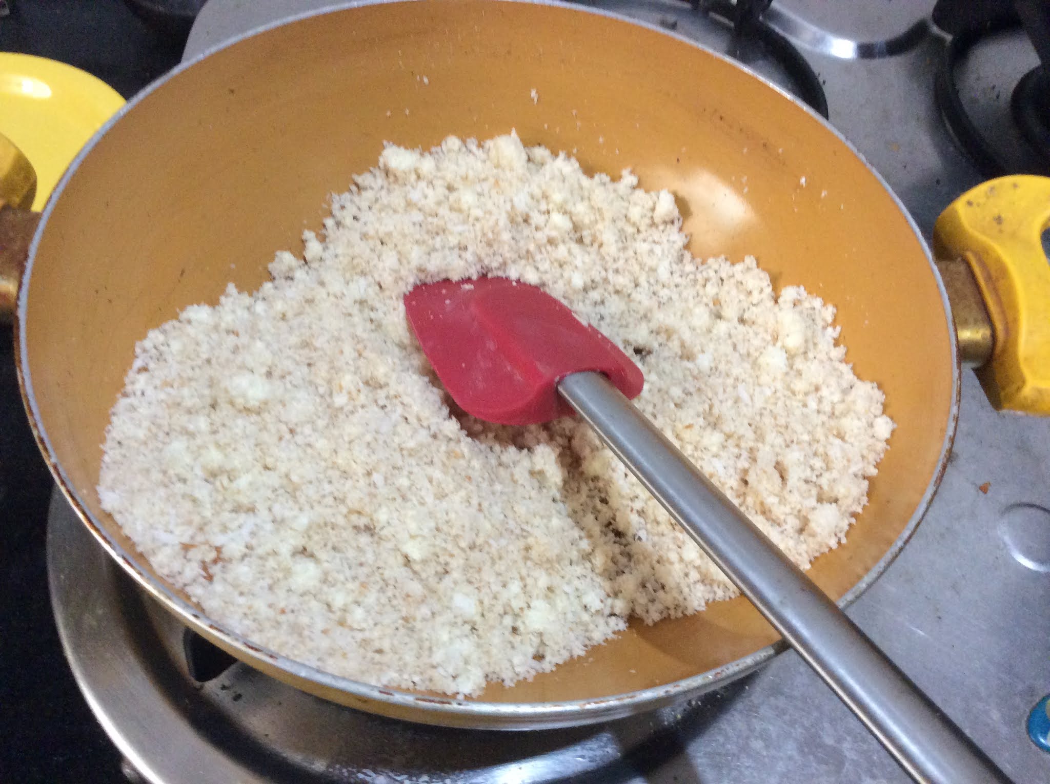• Add Desiccated coconut and bread crumbs to it, roast for 60 seconds, and remove from pan.