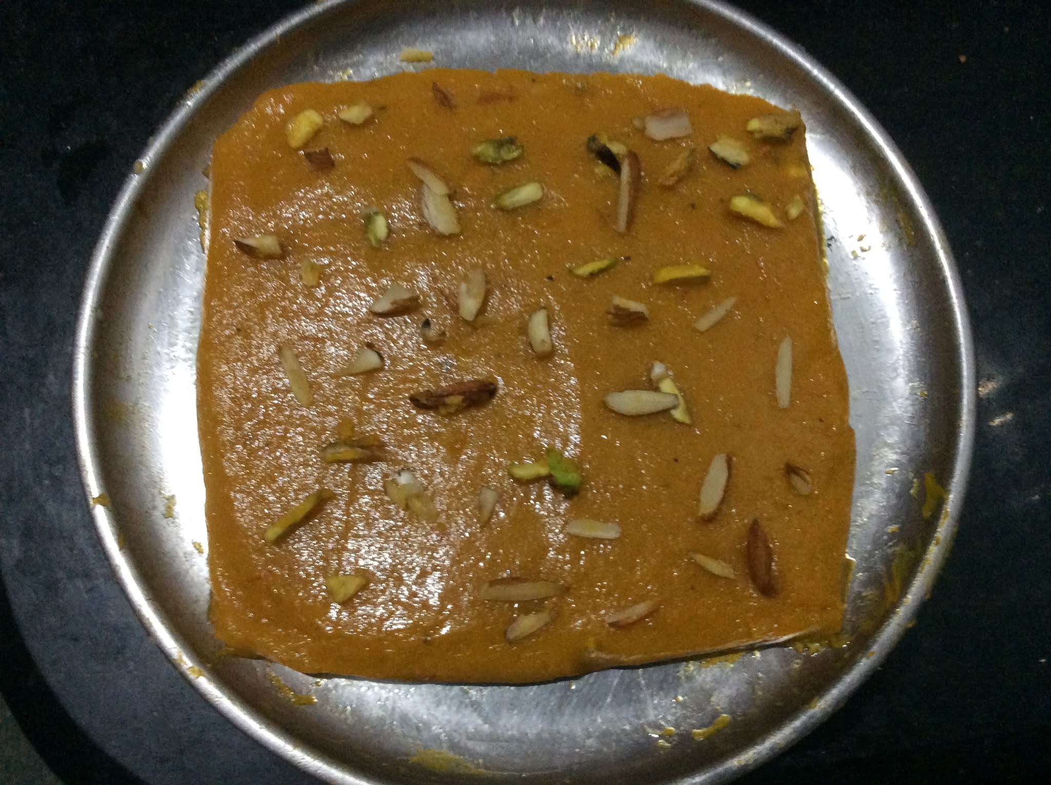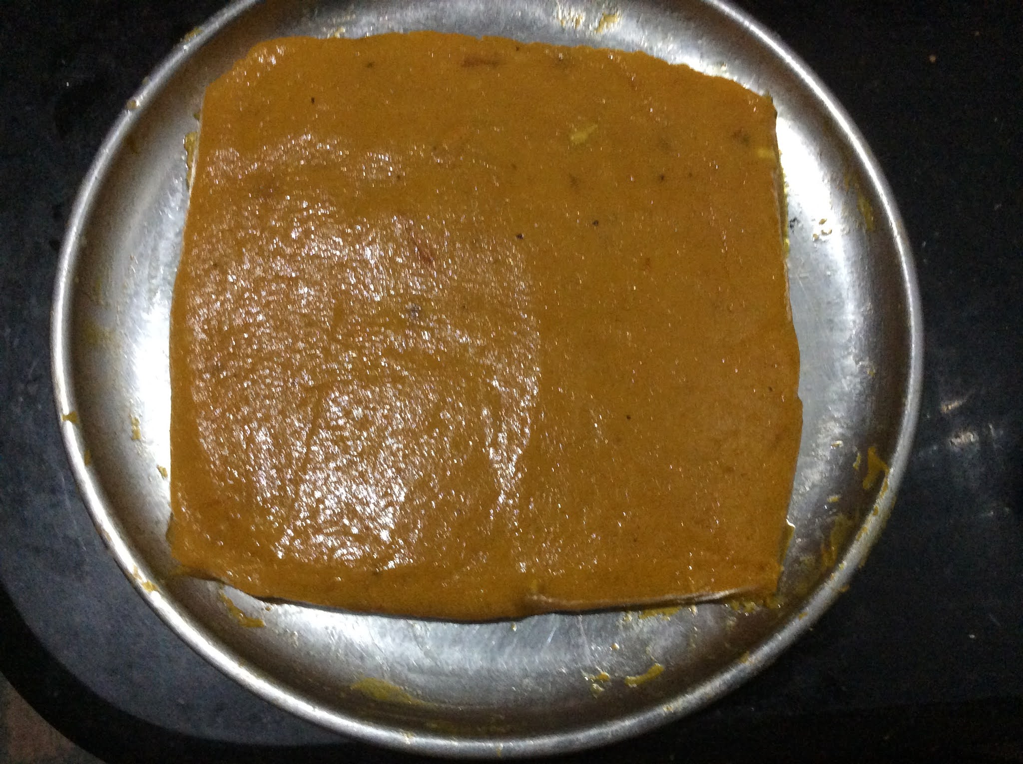 • Smear (grease) a plate with some ghee for setting the sweetness in it.