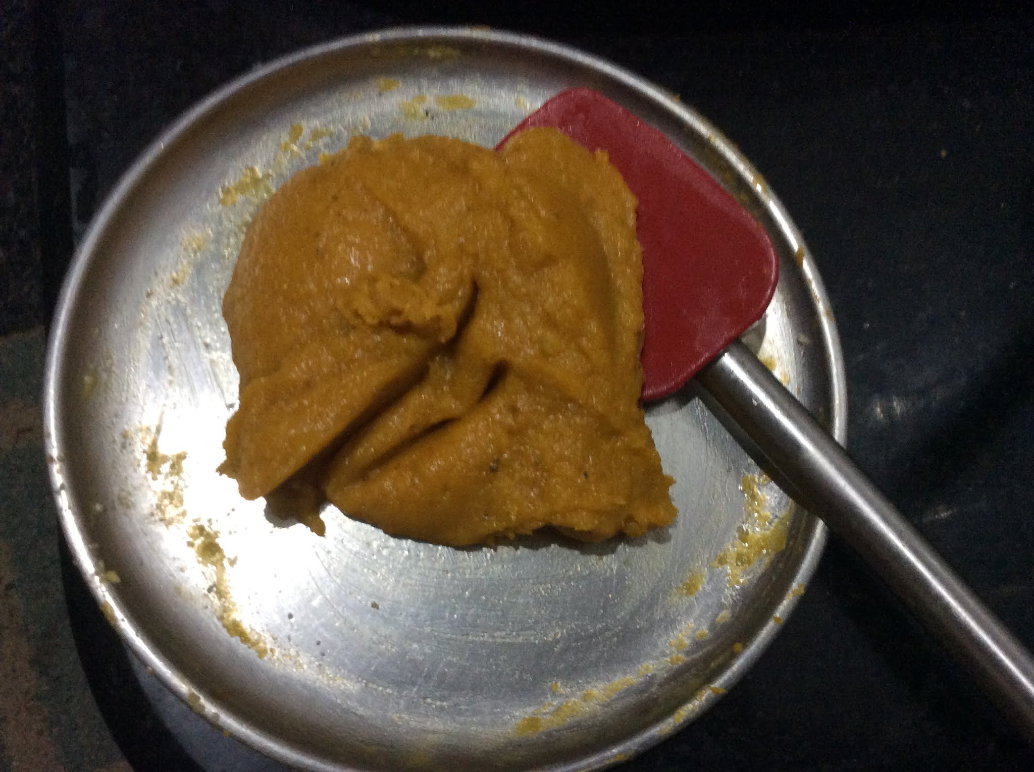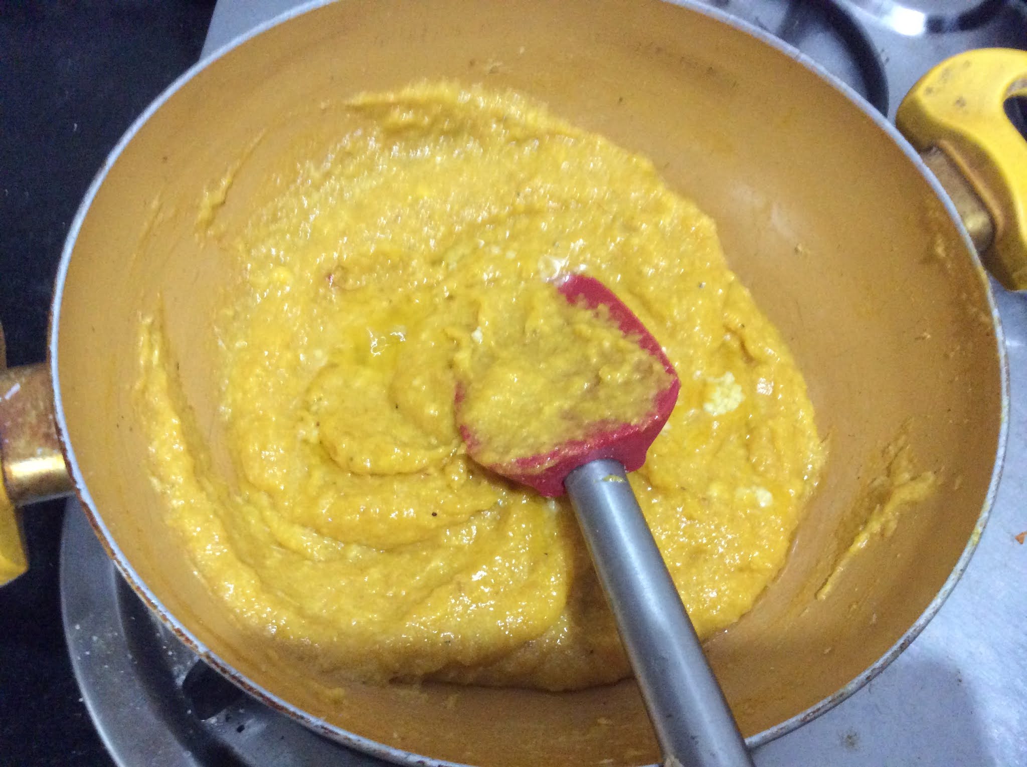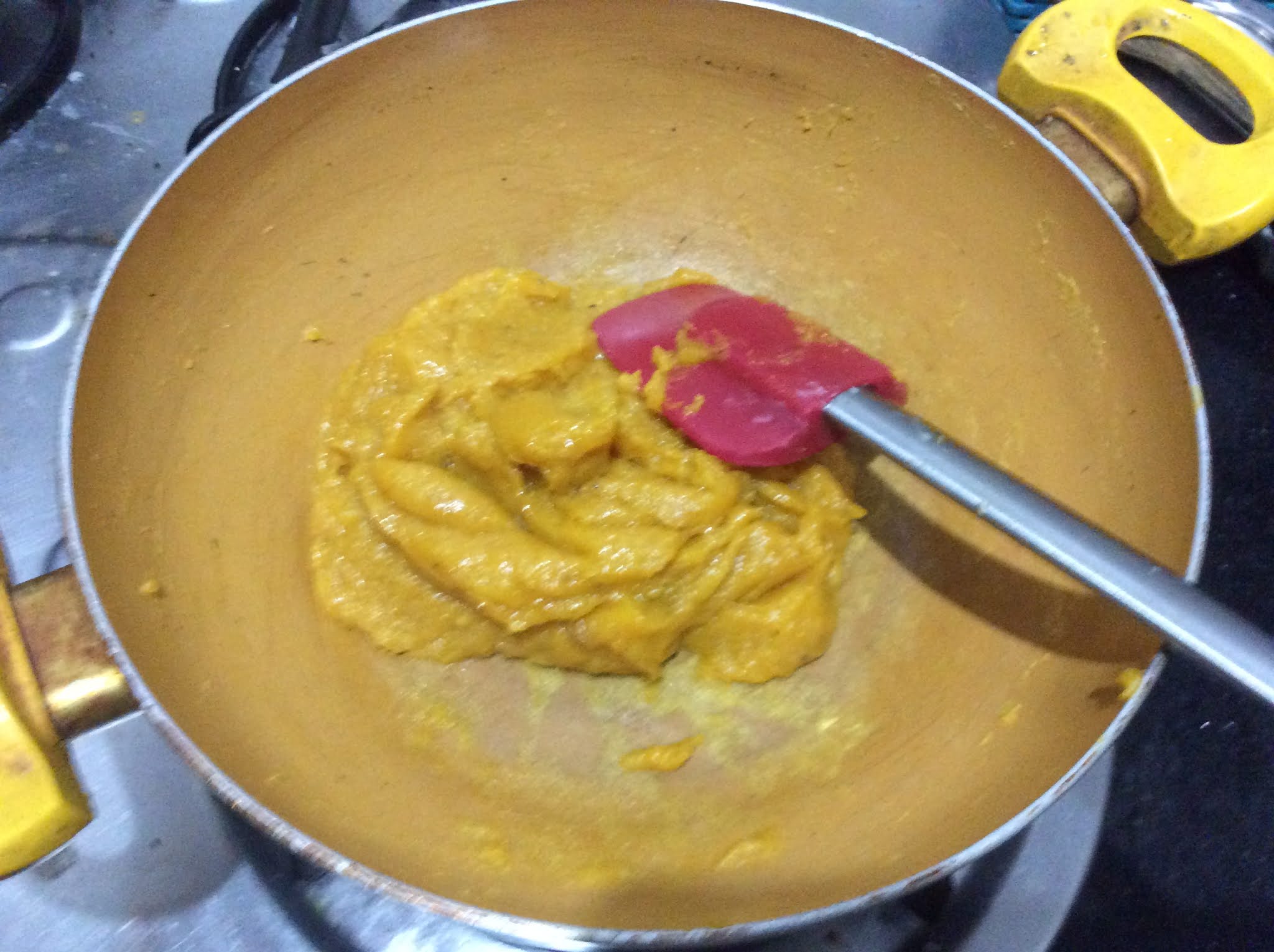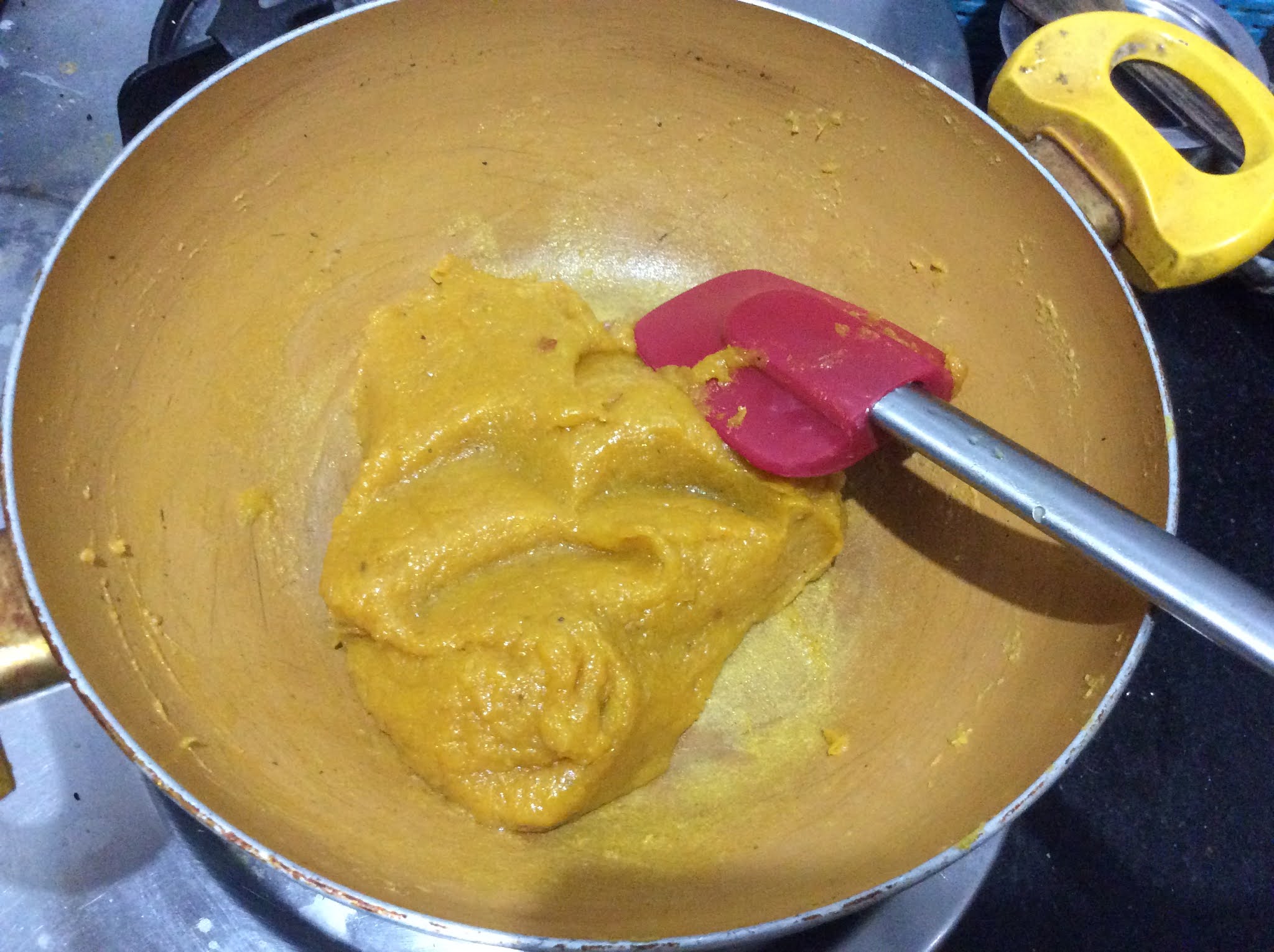 • Add 1 more teaspoon of ghee to it and cook till the color and form change. (thickens as soft dough).