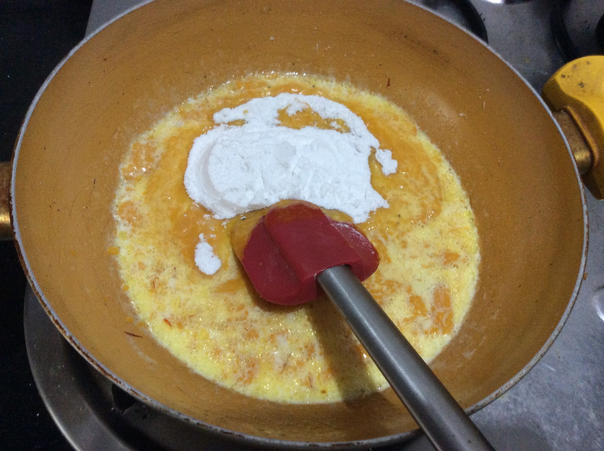 • Add mango puree and Sugar powder to the pan with milk and combine them all.