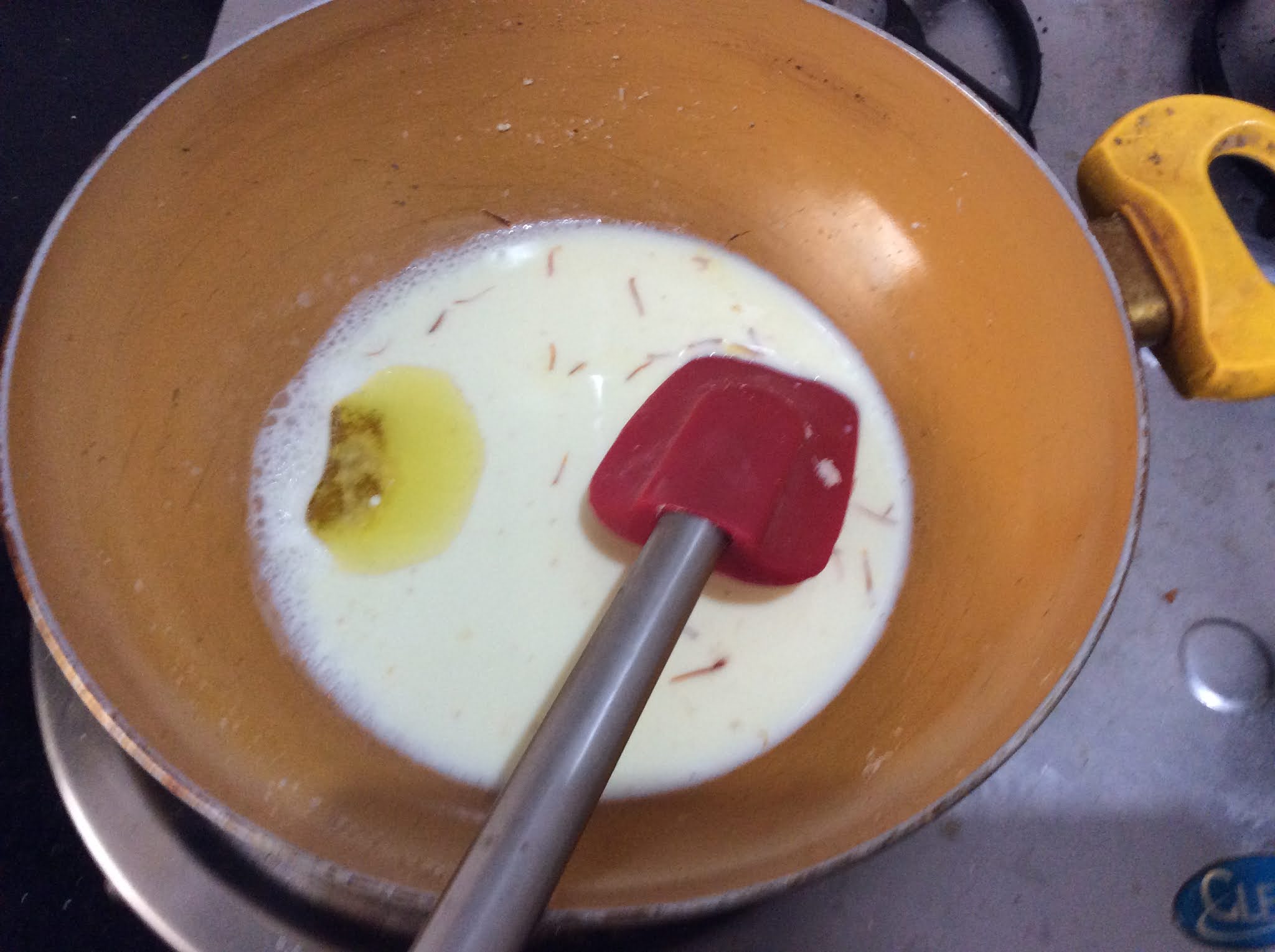 • Now to the same pan add milk with saffron, 1 teaspoon of ghee, and Milk powder.
