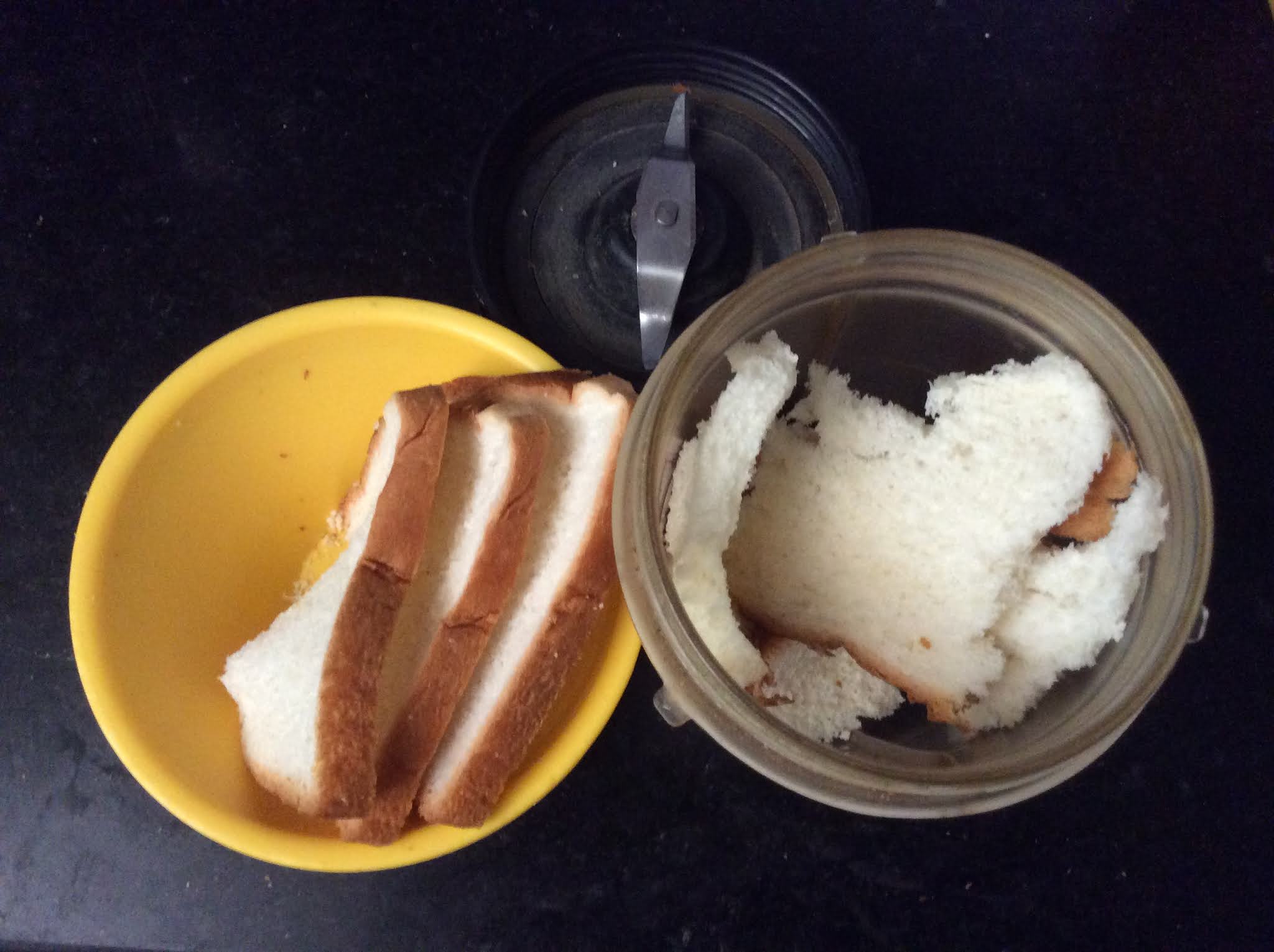 • Now take 4 slices of any Bread (white or brown bread), and just give a few pulses to make bread crumbs.