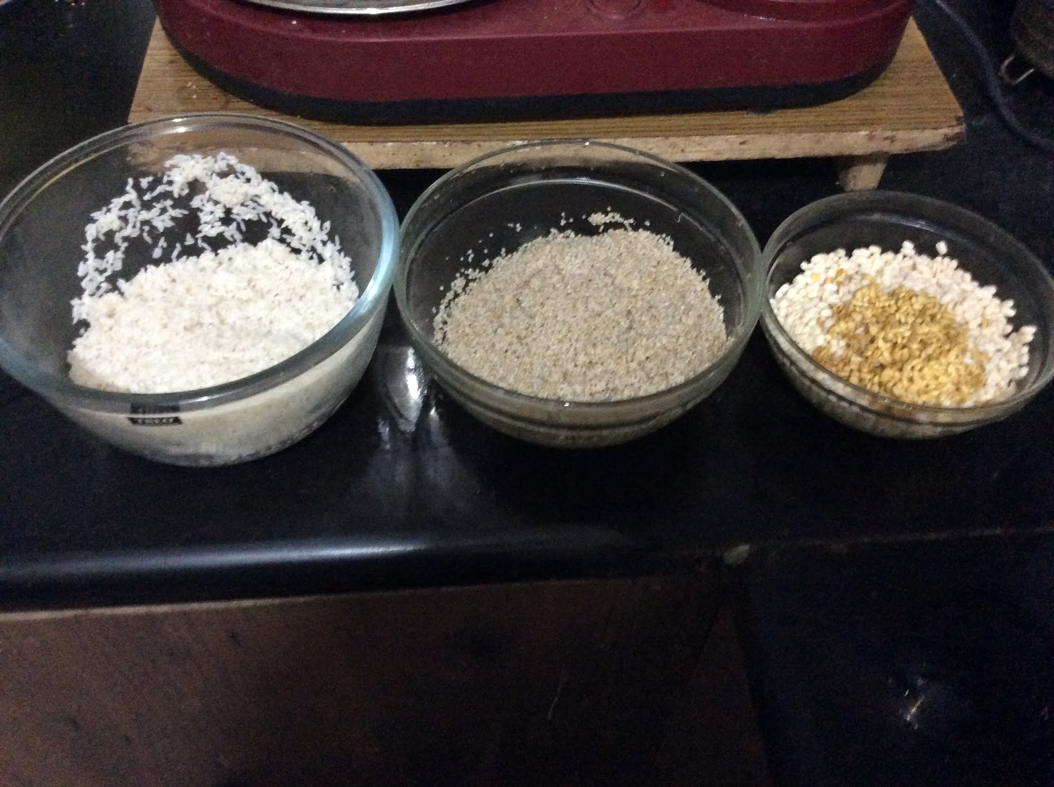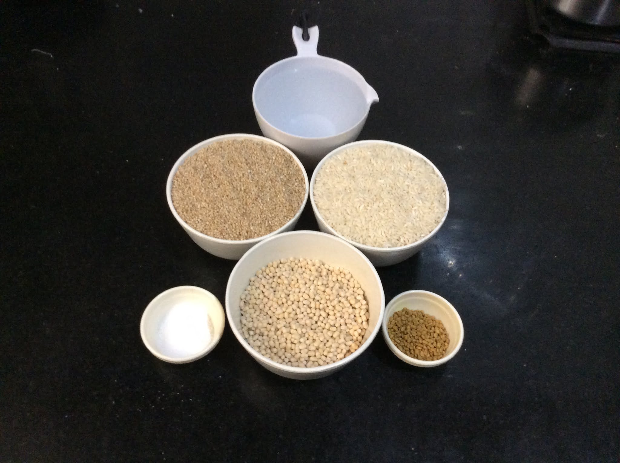 - Take the measured quantities of Little Millet, Rice, Whole Urad, and Fenugreek seeds in different bowls and wash each of them 2-3 times.