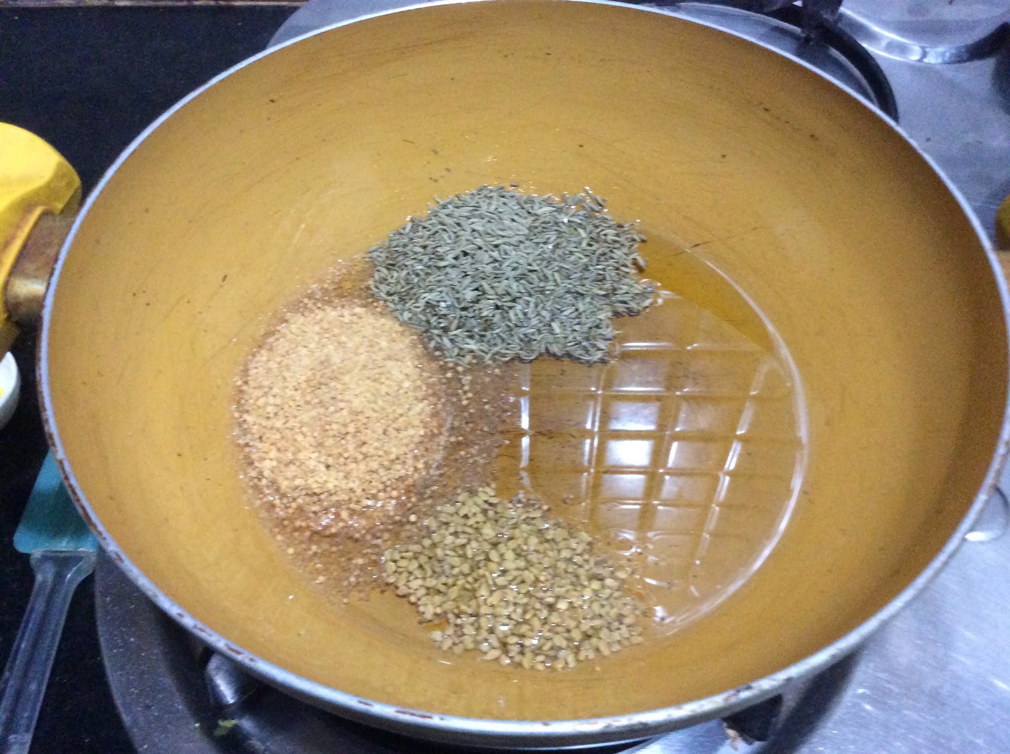 - Now put Fenugreek seeds, Fennel seeds, and Yellow mustard powder.
