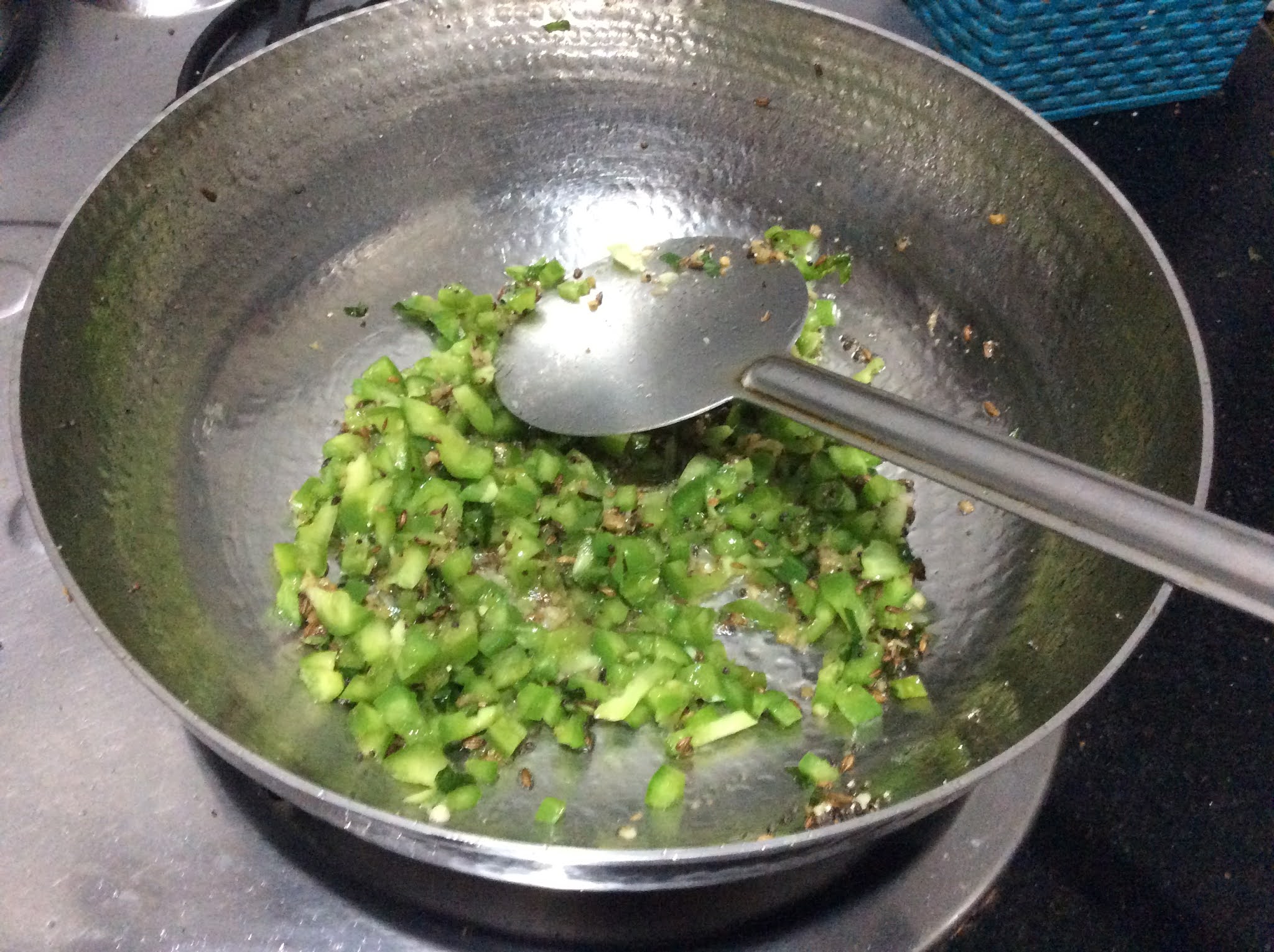- Now add green chilies, curry leaves, grated Ginger, and Capsicum pieces.