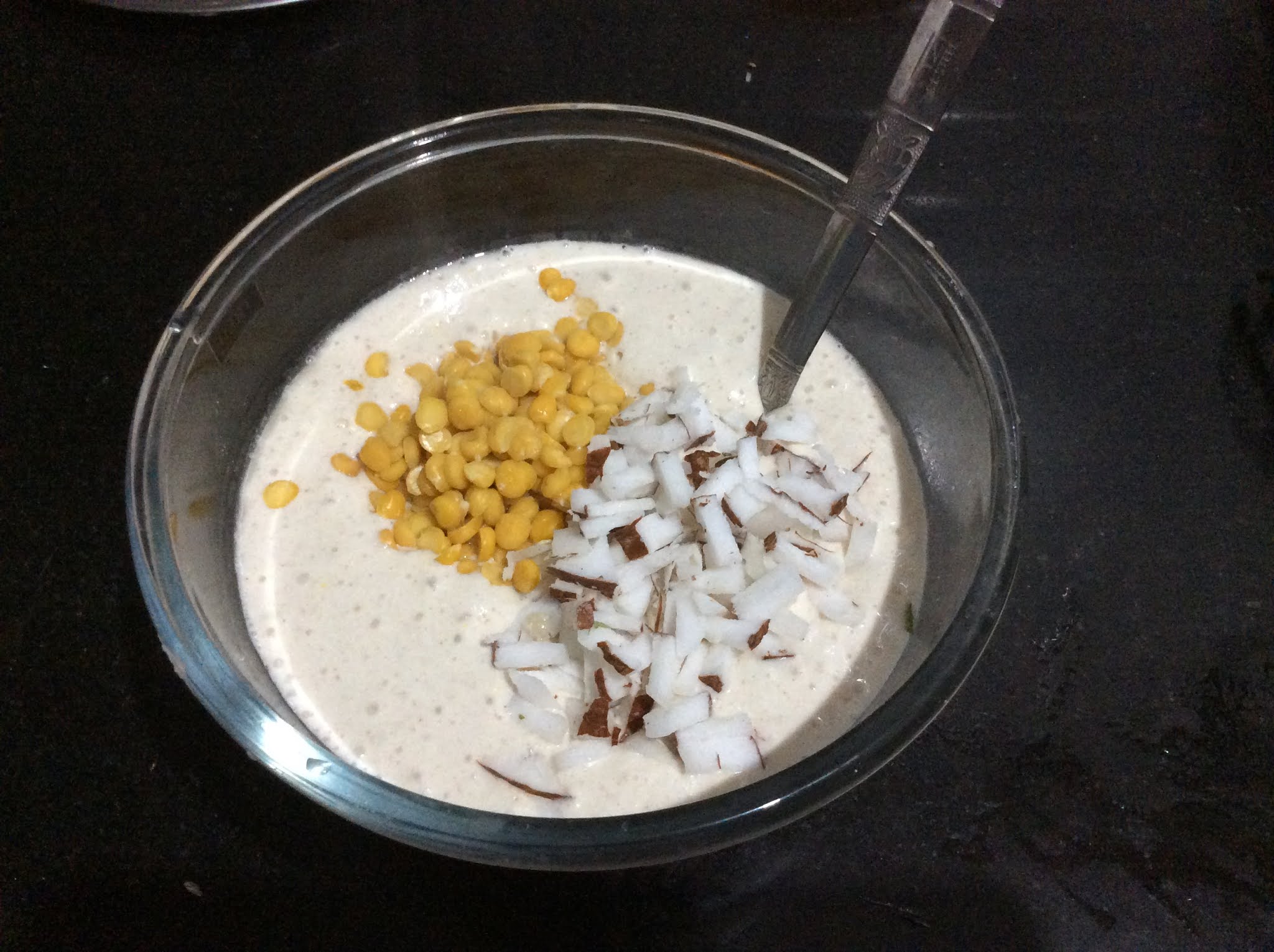 - Add the soaked chana dal and fresh coconut pieces to the Dosa batter.
