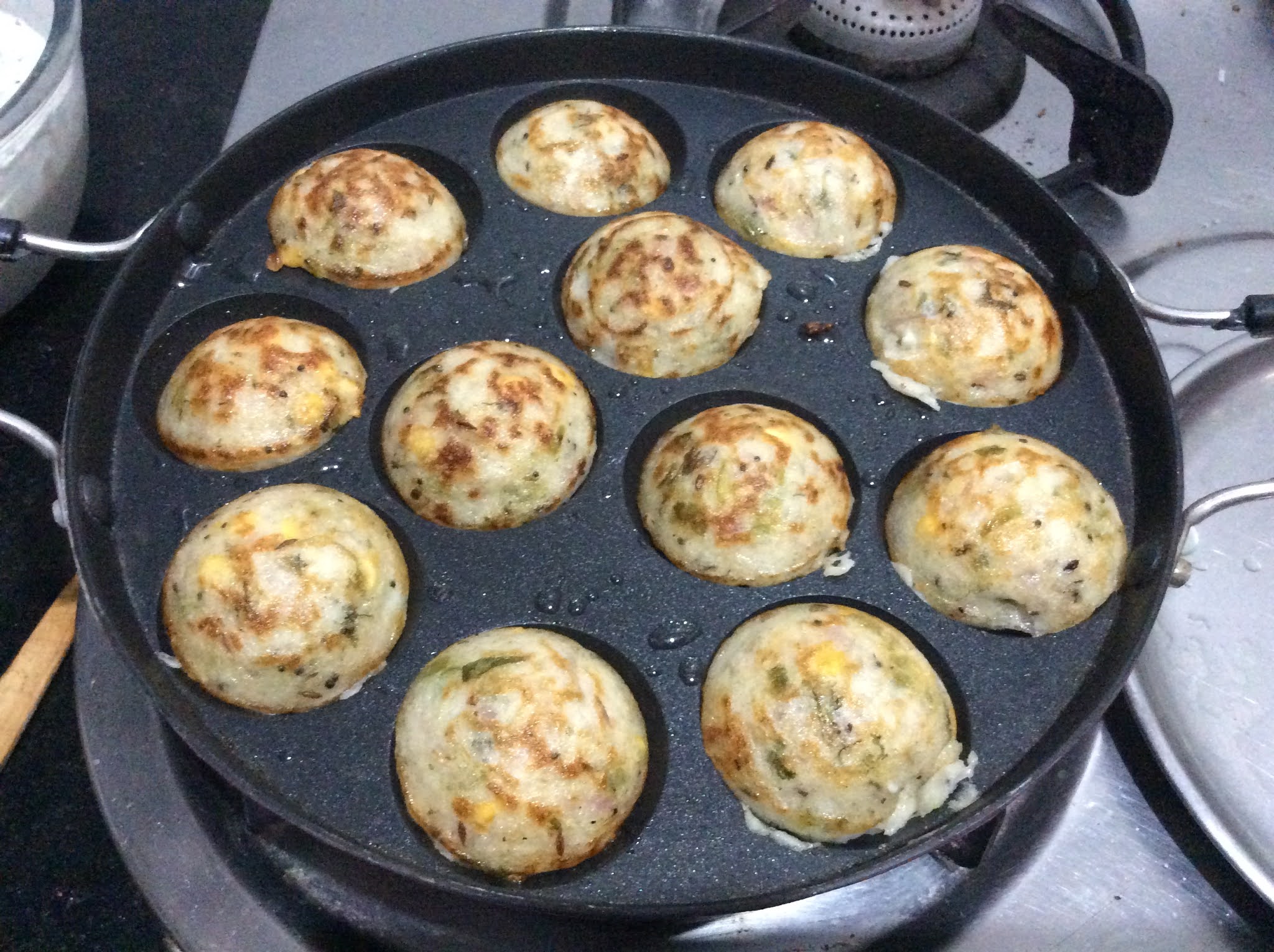- If it comes out easily, turn all of them and again put some oil on the sides of the groves to make the Paddu crispy.
