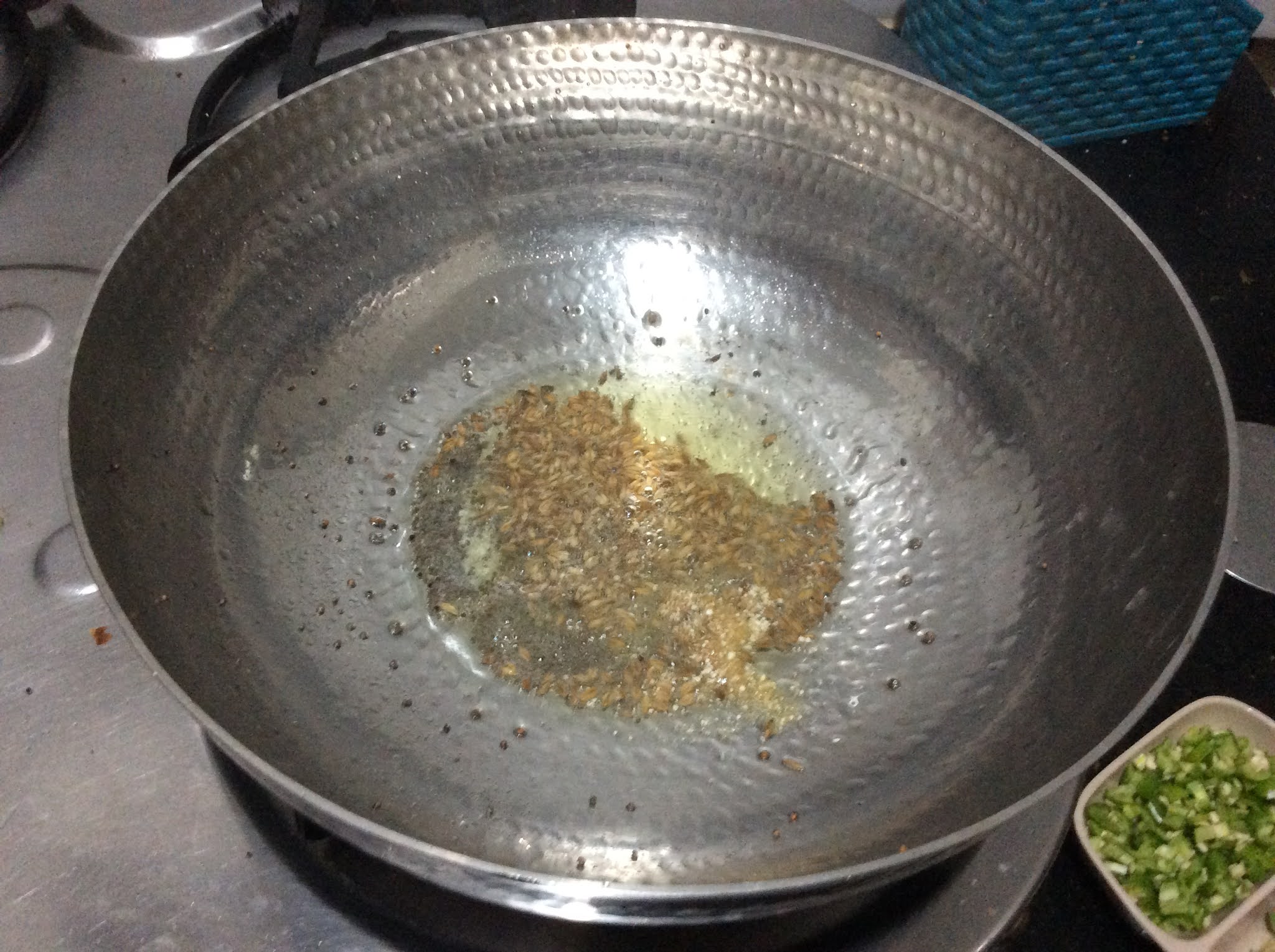 - Leave for a few seconds so that the Cumin and Mustard seeds crackle.