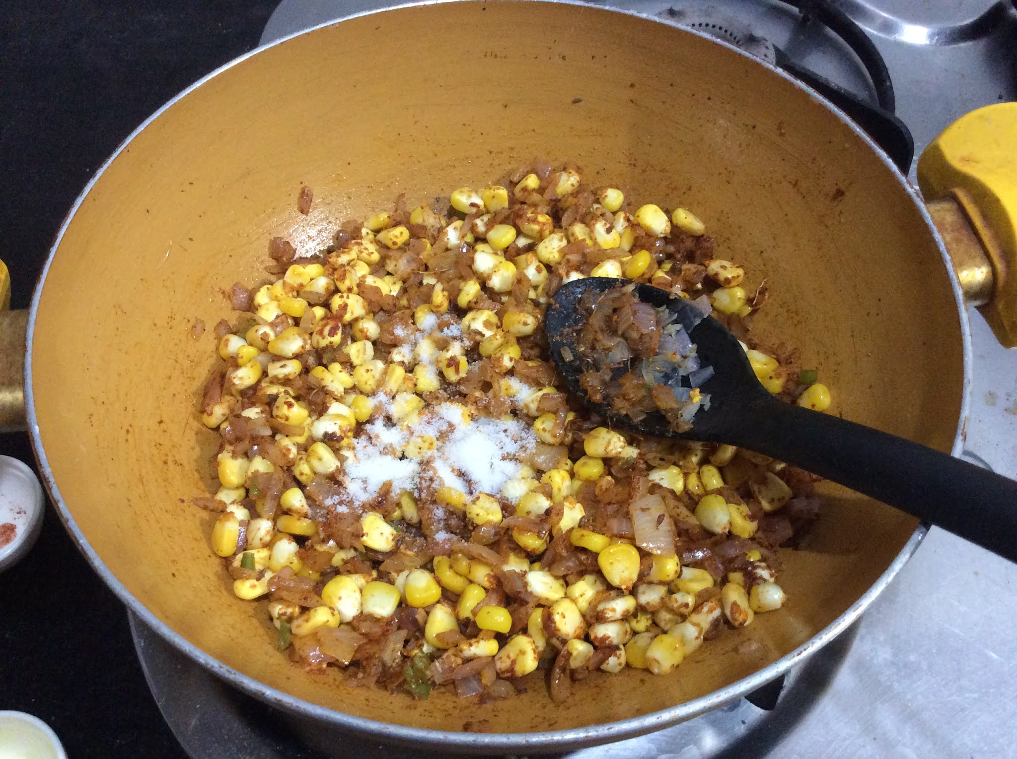 • Take a mixing bowl and put the ground paste and whole corn kernels.