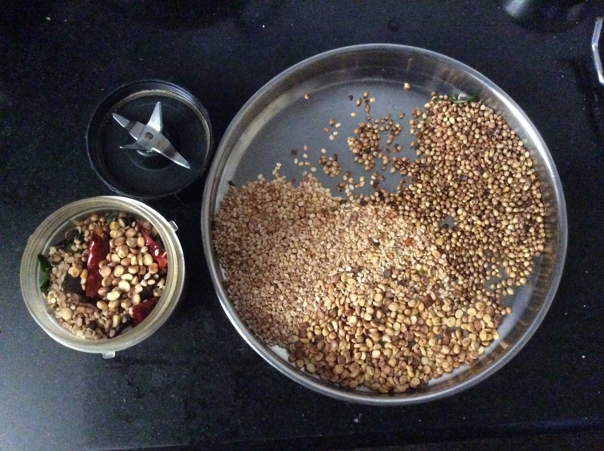 - If you are using this powder immediately, you can use 1/2 a cup of dry coconut and dry roast a bit, and grind it along with the other spices.
